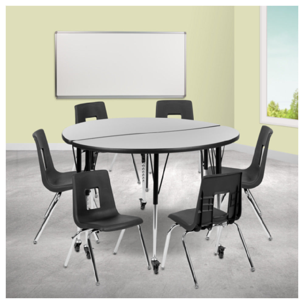 The Flash Furniture XU-GRP-16CH-A48-HCIRC-GY-T-A-CAS-GG Emmy Activity Table And Chair Set is a versatile and durable solution designed to meet the needs of educational and recreational environments. This set features a round table with a 48-inch diameter and adjustable height ranging from 17 to 25 inches, offering flexibility to accommodate different activities and users. The table is constructed with a laminate top, ensuring easy cleaning and resistance to wear and tear. Supported by 16-gauge tubular steel legs, the table provides robust stability and strength. The inclusion of locking casters enhances mobility, allowing for easy repositioning within a room. Complementing the table are six stackable chairs, each with a 16-inch seat height, making them suitable for a variety of users, from young students to adults. The chairs and table are finished with a nickel chrome plating, providing an elegant gray and black appearance that fits seamlessly into diverse settings. This activity table and chair set is ideal for schools, community centers, and corporate training rooms, offering a blend of practicality and style. Its thoughtful design and durable construction ensure it remains a valuable asset for any group activity setting.