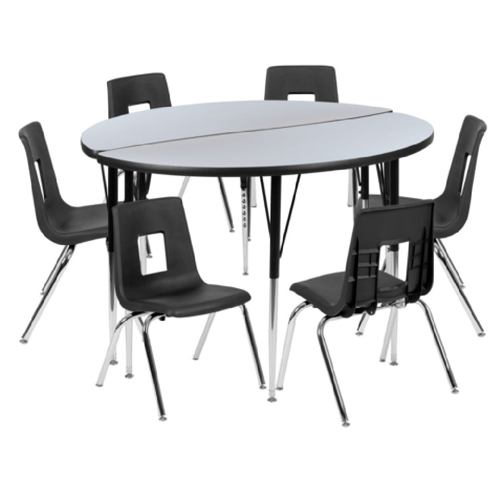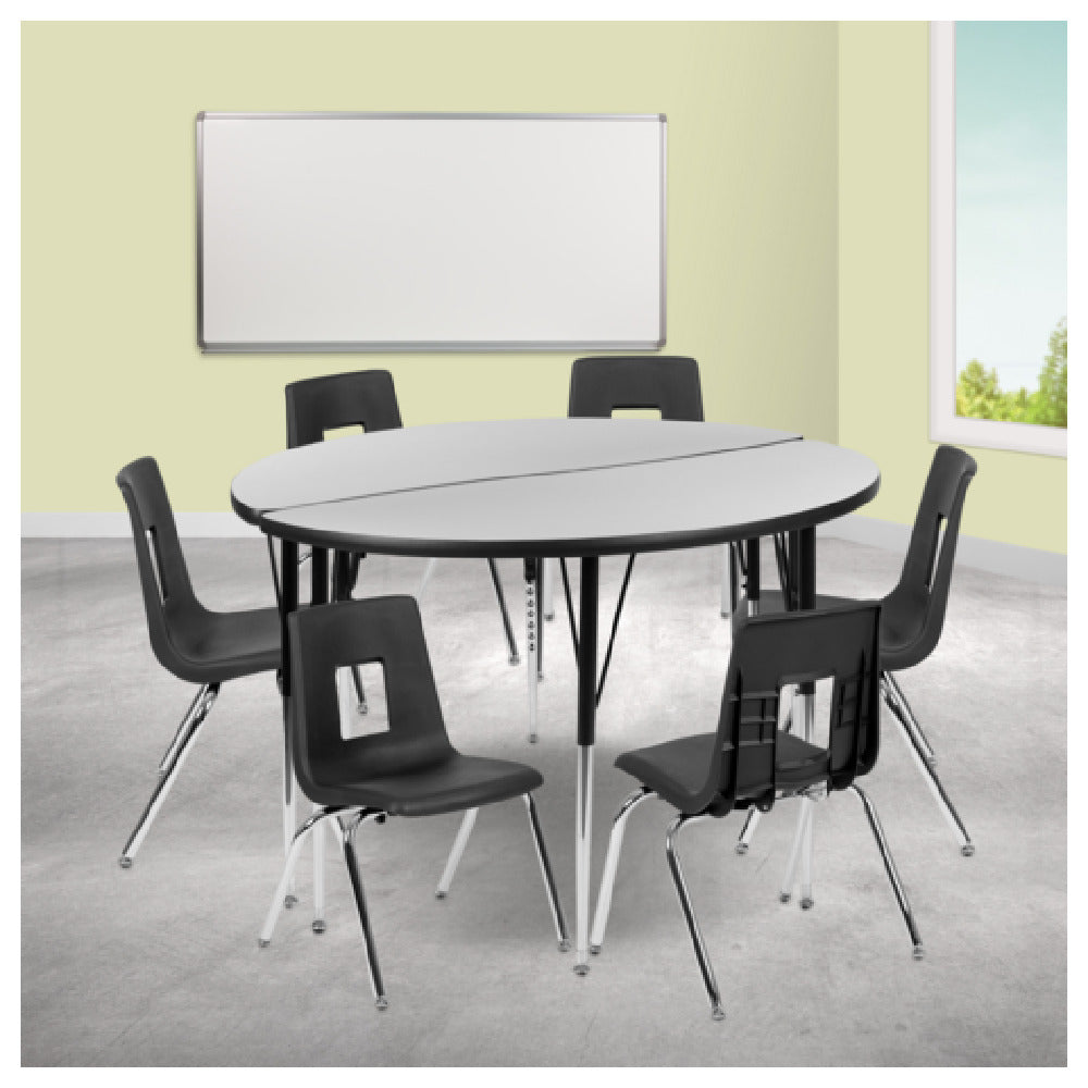 The Flash Furniture XU-GRP-16CH-A48-HCIRC-GY-T-A-GG Emmy Activity Table and Chair Set is an exemplary addition to any educational or creative space, providing a versatile and durable solution for various settings. This set includes a round activity table with a diameter of 48 inches and an adjustable height ranging from 16-1/4 to 25-1/4 inches, making it adaptable for different user needs. The table boasts a laminate top for easy cleaning and maintenance, while the 16-gauge tubular steel legs offer robust support and stability. Equipped with nylon floor glides, this table ensures smooth movement across surfaces without causing damage. Complementing the table are six stack chairs, each with a 16-inch seat height, designed to provide comfort and practicality. The chairs feature a nickel chrome-plated finish that enhances their aesthetic appeal while ensuring long-lasting durability. This set is finished in a contemporary gray and black color scheme, making it suitable for a variety of interior designs. Whether used in classrooms, art studios, or recreational areas, the Flash Furniture Emmy Activity Table and Chair Set is an ideal choice for environments that require reliable and flexible furniture solutions.