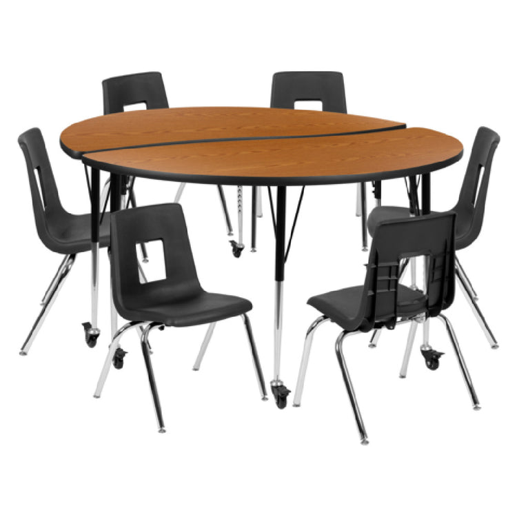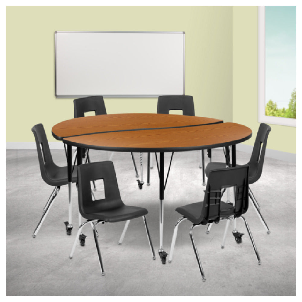 The Flash Furniture XU-GRP-16CH-A60-HCIRC-OAK-T-A-CAS-GG Emmy Activity Table and Chair Set is a versatile and robust furniture solution designed to meet the diverse needs of various markets, including educational institutions and collaborative work environments. This set features a round activity table with a 60-inch diameter and an adjustable height ranging from 17 to 25 inches, making it adaptable for different age groups and activities. The table boasts a durable laminate top supported by 16-gauge tubular steel legs, ensuring stability and longevity. Its locking casters provide mobility and convenience, allowing for easy reconfiguration of spaces. Complementing the table are six stackable chairs with a comfortable 16-inch seat height, ideal for accommodating users of different sizes. The chairs and table are finished in an appealing oak and black color scheme, with the legs showcasing a sleek nickel chrome plated finish, adding a modern touch to any setting. This activity table and chair set is perfect for fostering collaborative learning and interaction, offering both functionality and aesthetic appeal. The Emmy Activity Table and Chair Set is designed to cater to the needs of dynamic and versatile environments, making it an essential asset for enhancing productivity and engagement.