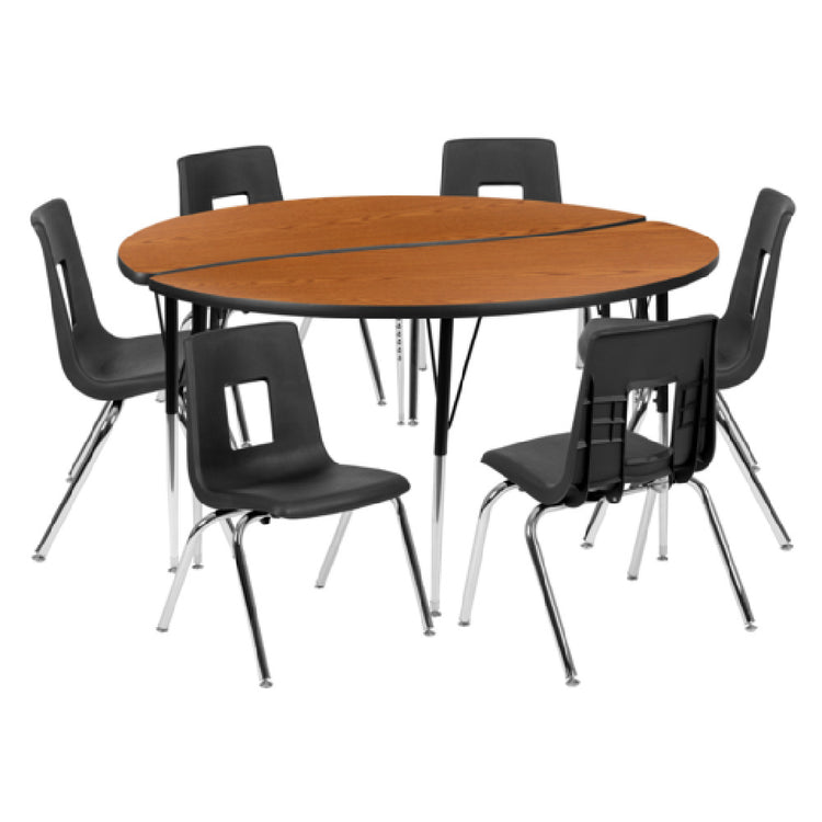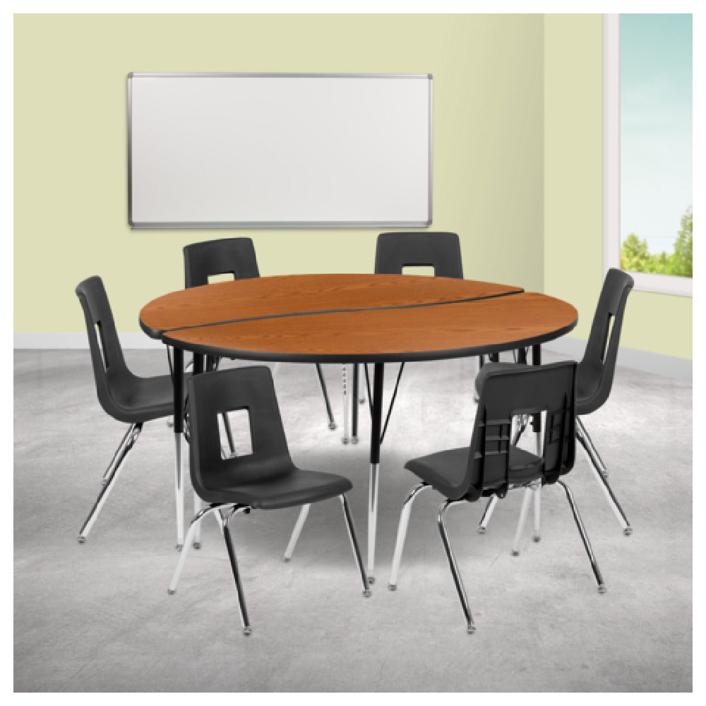 The Flash Furniture XU-GRP-16CH-A60-HCIRC-OAK-T-A-GG Emmy Activity Table and Chair Set is a versatile solution for educational and recreational environments, designed to meet the diverse needs of classrooms, daycare centers, and activity rooms. This set features a 60-inch diameter round table with adjustable height ranging from 16-1/4 to 25-1/4 inches, providing flexibility for various age groups and activities. The table's laminate top ensures durability and easy maintenance, while the sturdy 16-gauge tubular steel legs offer stability and strength. Complementing the table are six stackable chairs, each with a 16-inch seat height, ideal for comfortable seating. The chairs are designed for convenience and space-saving with their stackable nature. Nickel chrome-plated finishes on both the table and chairs ensure a sleek appearance and resistance to everyday wear. Nylon floor glides are incorporated to protect floors from scratches and facilitate smooth movement. The oak/black color scheme adds a touch of elegance, making it suitable for various decor styles. This Emmy Activity Table and Chair Set is an excellent choice for those seeking a reliable, attractive, and adaptable furniture solution for dynamic learning and interactive environments.