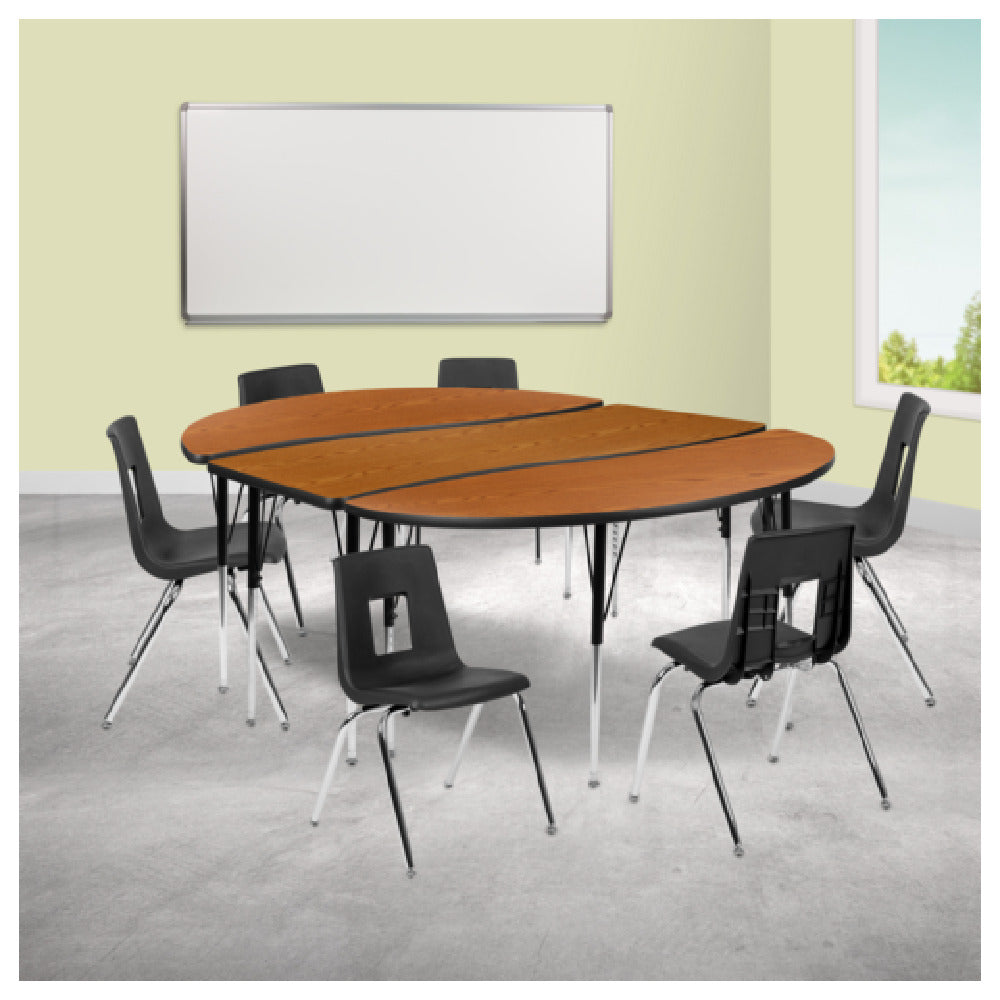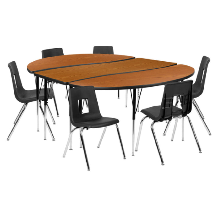 The Flash Furniture XU-GRP-18CH-A3060CON-60-OAK-T-A-GG Emmy Activity Table And Chair Set is a versatile and robust solution designed to cater to various educational and activity settings. This set includes a spacious oval activity table, measuring 86 inches in width, 60 inches in depth, and adjustable height ranging from 16-1/4 inches to 25-1/4 inches, providing ample space for group activities and learning sessions. The table features a laminate top, ensuring durability and easy maintenance, supported by 16-gauge tubular steel legs that offer stability and strength. Nylon floor glides are incorporated to protect flooring and facilitate smooth movement. Accompanying the table are six stack chairs, each with an 18-inch seat height, designed for comfort and ease of stacking when not in use. The chairs feature a nickel chrome-plated finish, adding a sleek aesthetic touch to the oak and black color scheme of the set. This activity table and chair set is ideal for educational institutions, training centers, and collaborative work environments where durable, flexible, and aesthetically pleasing furniture solutions are required to support dynamic learning and interaction.
