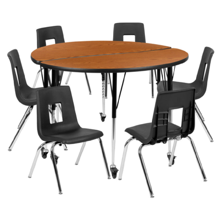 The Flash Furniture XU-GRP-18CH-A48-HCIRC-OAK-T-A-CAS-GG Emmy Activity Table and Chair Set is an adaptable solution designed to meet the diverse needs of educational and activity spaces. Featuring a round table with a 48-inch diameter and adjustable height ranging from 17 to 25 inches, it is crafted with a durable laminate top supported by 16-gauge tubular steel legs. The inclusion of locking casters ensures easy mobility and stability, making it an ideal choice for dynamic learning environments. Complementing the table are six stackable chairs, each with an 18-inch seat height, finished in a sleek nickel chrome plating. The oak and black color scheme offers a sophisticated appearance that fits seamlessly into various settings. This versatile set is perfect for schools, community centers, or any collaborative workspace where functionality and flexibility are essential. Its robust construction and practical design provide an efficient and reliable option for facilitating group activities, discussions, or educational tasks, demonstrating its unique value across different industry segments.