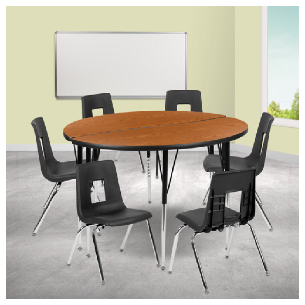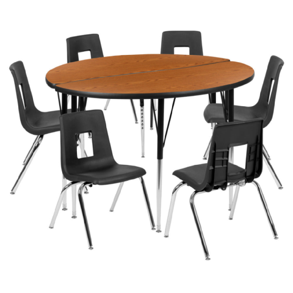 The Flash Furniture XU-GRP-18CH-A48-HCIRC-OAK-T-A-GG Emmy Activity Table and Chair Set is a versatile and durable solution for a variety of educational and recreational environments. Featuring a 48-inch diameter round table with a height adjustable from 16-1/4 to 25-1/4 inches, this set is adaptable for users of varying ages and needs. The table boasts a laminate top designed for resilience and ease of maintenance, supported by sturdy 16-gauge tubular steel legs that ensure stability. Each leg is equipped with nylon floor glides, protecting flooring while providing smooth movement. The set includes six stackable chairs with an 18-inch seat height, accommodating comfortable seating arrangements for various activities. The chairs and table come in a sophisticated oak and black finish, enhanced by nickel chrome plating for a contemporary aesthetic. This Emmy Activity Table and Chair Set presents a practical and stylish option for classrooms, activity centers, and community spaces, offering flexible functionality with a focus on durability and style. Whether for collaborative group work or individual projects, this set meets the demands of a dynamic environment, supporting educational growth and engagement in a structured yet flexible setting.
