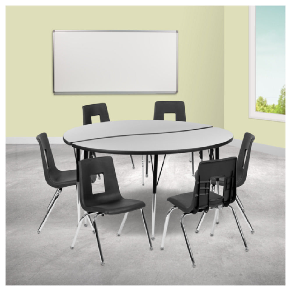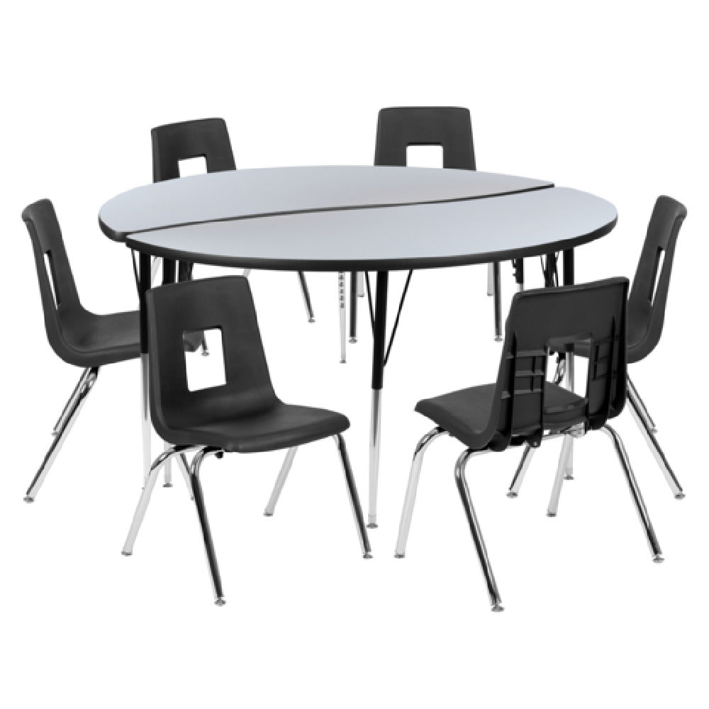 The Flash Furniture XU-GRP-18CH-A60-HCIRC-GY-T-A-GG Emmy Activity Table And Chair Set is designed to meet the needs of educational and recreational environments with its versatile features. This set includes a 60-inch diameter round table, adjustable in height from 16-1/4 to 25-1/4 inches, ensuring adaptability for various activities and users. The table boasts a durable laminate top, supported by sturdy 16-gauge tubular steel legs, which provide stability and longevity. Nylon floor glides are incorporated to safeguard flooring surfaces and facilitate smooth mobility. Accompanying the table are six stack chairs with an 18-inch seat height, designed for comfort and easy storage. The chairs and table feature a nickel chrome plated finish, adding a sleek aesthetic to the gray and black color scheme. This set is ideal for classrooms, play areas, or collaborative spaces, offering a practical and stylish solution for diverse settings. Its robust construction ensures it can withstand daily use, making it a reliable choice for institutions seeking functional and enduring furniture solutions.