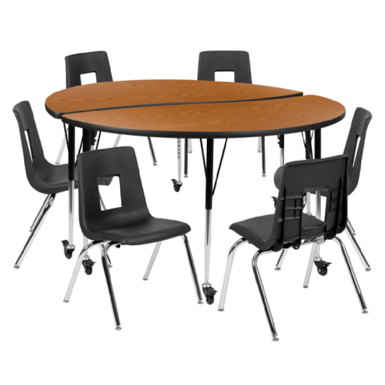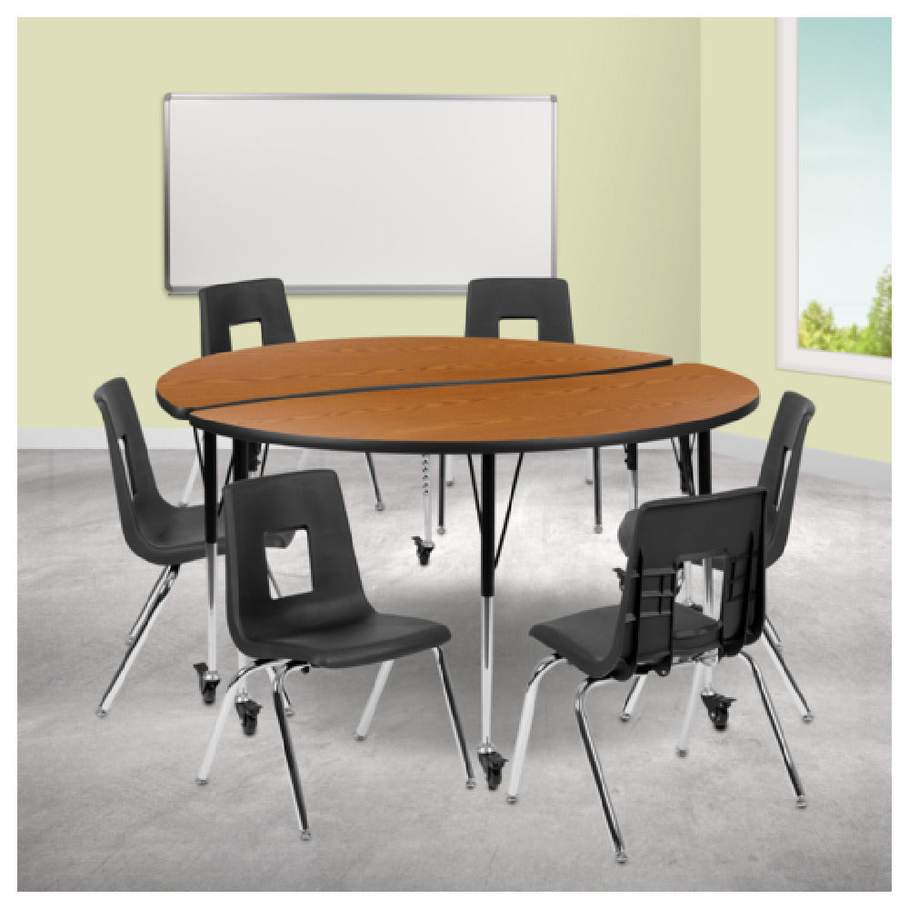 The Flash Furniture XU-GRP-18CH-A60-HCIRC-OAK-T-A-CAS-GG Emmy Activity Table and Chair Set is a versatile and durable furniture solution designed for various educational and recreational settings. Featuring a 60-inch diameter round table, this set combines functionality with robust construction. The table is equipped with a laminate top and supported by 16-gauge tubular steel legs, providing both stability and longevity. Its adjustable height ranges from 17 to 25 inches, catering to users of different ages and ensuring ergonomic comfort. The inclusion of locking casters adds mobility, allowing for easy rearrangement in dynamic environments. Complementing the table are six stack chairs, each with an 18-inch seat height, offering a comfortable sitting experience. The chairs and table feature a nickel chrome-plated finish, enhancing their aesthetic appeal while ensuring resistance to wear and tear. The oak and black color scheme of the set further add to its versatility, making it suitable for various interior styles. Ideal for classrooms, libraries, and activity rooms, this Emmy Activity Table and Chair Set seamlessly blends functionality with style, meeting the diverse needs of educational institutions and recreational facilities.