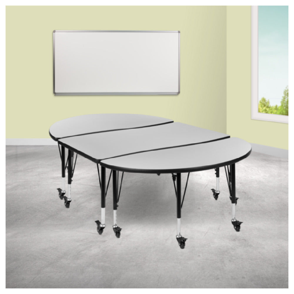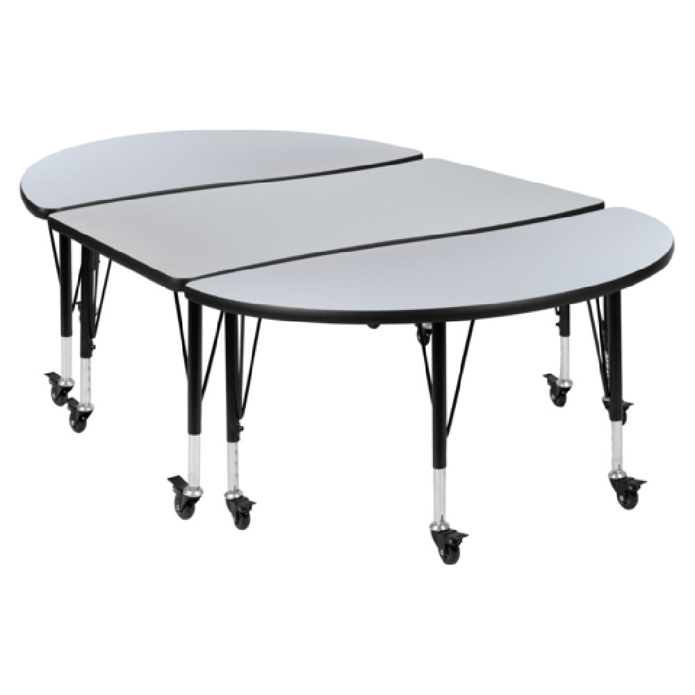 The Flash Furniture XU-GRP-A3048CON-48-GY-T-P-CAS-GG Emmy Activity Table 3-Piece Set is a versatile and innovative choice for educational and professional environments. Measuring 76 inches wide by 47-1/2 inches deep, this table boasts an adjustable height range of 17 to 25 inches, catering to various activities and user requirements. Its unique oval wave design is complemented by a 1-inch thick thermal fused gray laminate top that offers a scratch and stain resistant surface, ensuring durability and longevity. The black edge banding provides an additional layer of protection, while the robust 16-gauge tubular steel legs guarantee stability. The black powder-coated upper legs and chrome lower legs add a sleek aesthetic appeal. Enhanced mobility is ensured with locking casters, making it easy to move the table as needed. Some assembly is required. This product is ideal for schools, training facilities, and collaborative workspaces, offering a combination of functional design and resilience suited to high-traffic areas. Its adjustable features and durable construction make it a practical solution for varying institutional and professional applications, delivering both adaptability and performance.