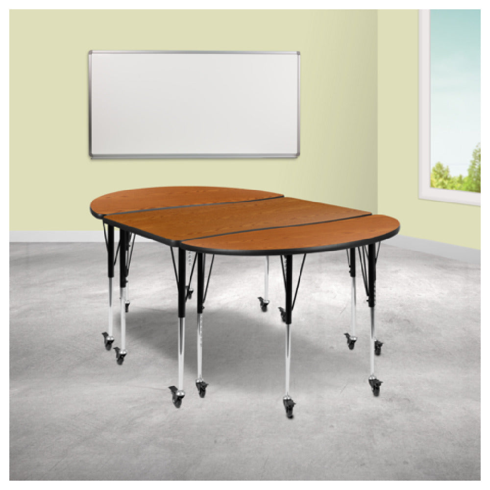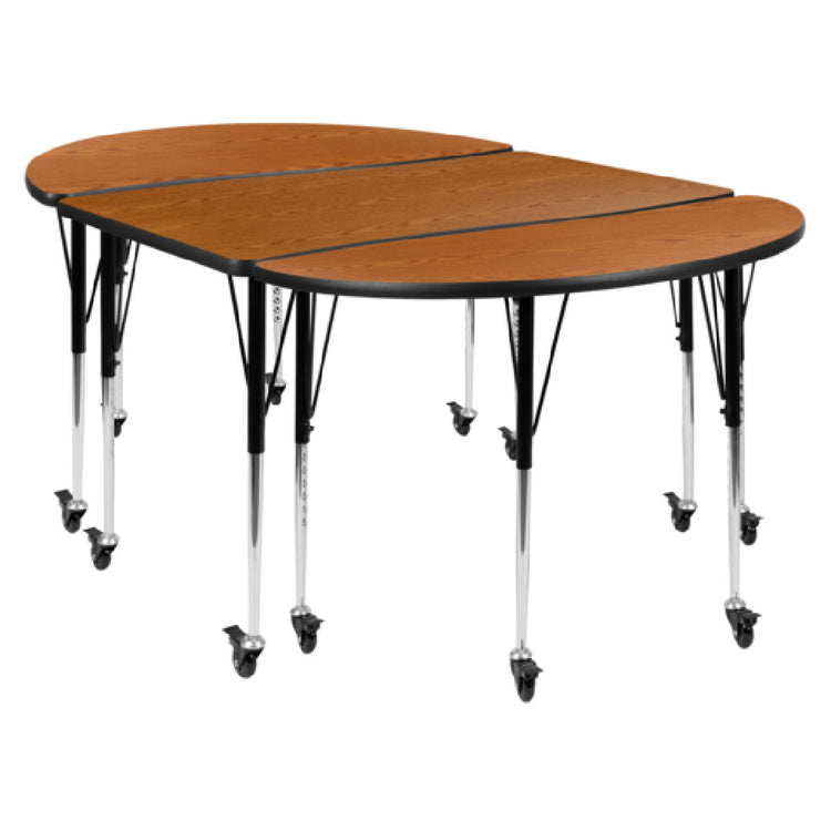 The Flash Furniture XU-GRP-A3048CON-48-OAK-T-A-CAS-GG Emmy Activity Table 3-Piece Set is a versatile solution for educational and professional environments requiring adaptable furniture. This table spans 76 inches in width and 47-1/2 inches in depth, with an adjustable height ranging from 22 to 30 inches, catering to a variety of seating needs. Its unique oval wave design, coupled with a sturdy 1-inch thick thermal fused oak laminate top, offers both aesthetic appeal and durability. The table surface is engineered to resist scratches and stains, ensuring longevity in high-traffic areas. A black edge band provides additional protection and a sleek finish. Constructed with 16 gauge tubular steel legs, the table is built for stability, featuring black powder-coated upper legs and chrome lower legs for a modern look. Equipped with locking casters, this set allows for effortless mobility and secure placement within any space, making it ideal for dynamic work or learning environments. While assembly is required, the robust construction and adjustable features of the Emmy Activity Table 3-Piece Set make it a valuable asset for schools, offices, and collaborative spaces seeking reliable, adaptable, and stylish furniture solutions.