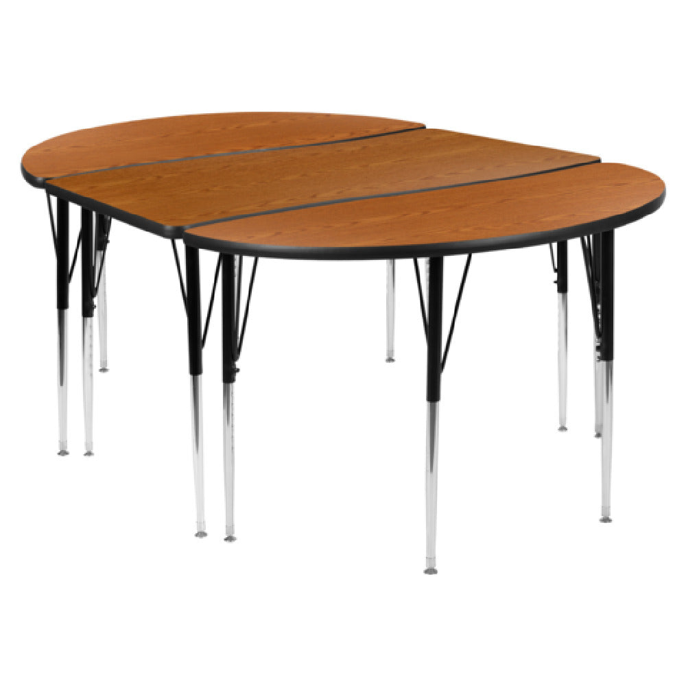 The Flash Furniture XU-GRP-A3048CON-48-OAK-T-A-GG Emmy Activity Table 2-Piece Set is a versatile piece of furniture designed to meet the demands of various environments such as educational institutions, corporate settings, and creative workspaces. Measuring 76 inches in width, 47-1/2 inches in depth, and featuring an adjustable height range from 21-1/4 inches to 30-1/4 inches, this table accommodates a wide range of user needs. The oval wave design, complemented by a 1-inch thick thermal fused oak laminate top, ensures durability and aesthetic appeal. The surface is both scratch and stain-resistant, offering longevity and ease of maintenance, making it suitable for high-traffic areas. Encased with a black edge band, the table's robust 16 gauge tubular steel legs provide stability, with black powder-coated upper legs and chrome lower legs adding to its sleek appearance. The inclusion of self-leveling nylon floor glides guarantees stability on uneven surfaces, protecting floors from damage. This Emmy Activity Table 2-Piece Set is a practical and stylish solution for diverse market segments, providing an adaptable workspace that meets various functional and design requirements.