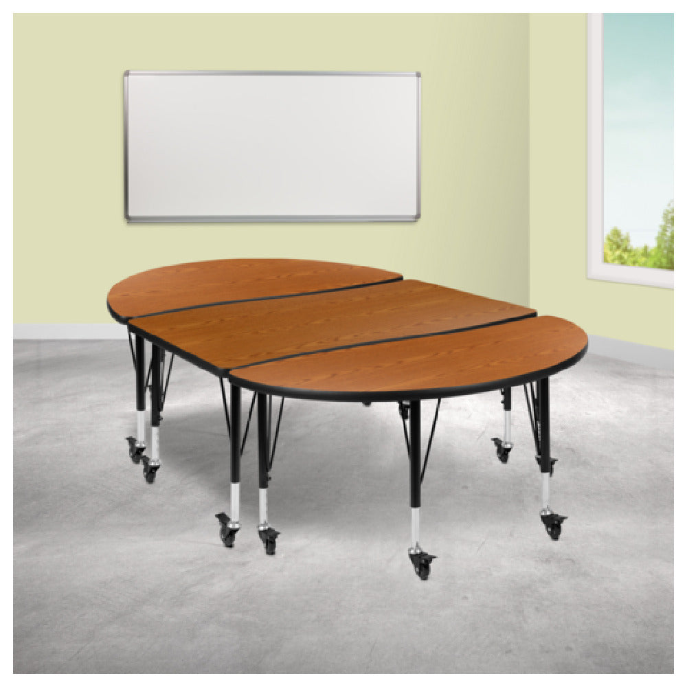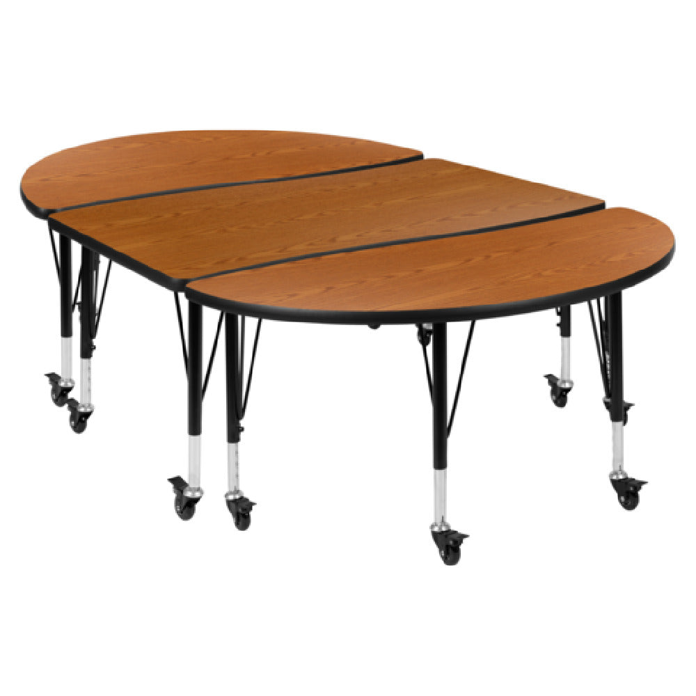 The Flash Furniture XU-GRP-A3048CON-48-OAK-T-P-CAS-GG Emmy Activity Table 3-Piece Set is a versatile and durable furniture solution designed to meet diverse needs across various sectors. This table measures 76 inches in width and 47-1/2 inches in depth, with an adjustable height range from 17 to 25 inches, catering to users of different sizes and preferences. The oval wave design paired with a 1-inch thick thermal fused oak laminate top offers a stylish yet functional surface, resistant to both scratches and stains, ensuring long-lasting aesthetic appeal and ease of maintenance. Encased with a black edge band, it adds an extra layer of protection and visual contrast. The table is supported by 16-gauge tubular steel legs, featuring black powder-coated upper legs and chrome lower legs, providing strength and stability. For added convenience, this set comes with locking casters, allowing for easy mobility and secure placement in any setting, whether it’s a classroom, office, or home environment. Assembly is required, allowing for customizable setup according to specific needs. The Flash Furniture Emmy Activity Table is an excellent choice for those seeking a multi-functional and reliable workspace solution.