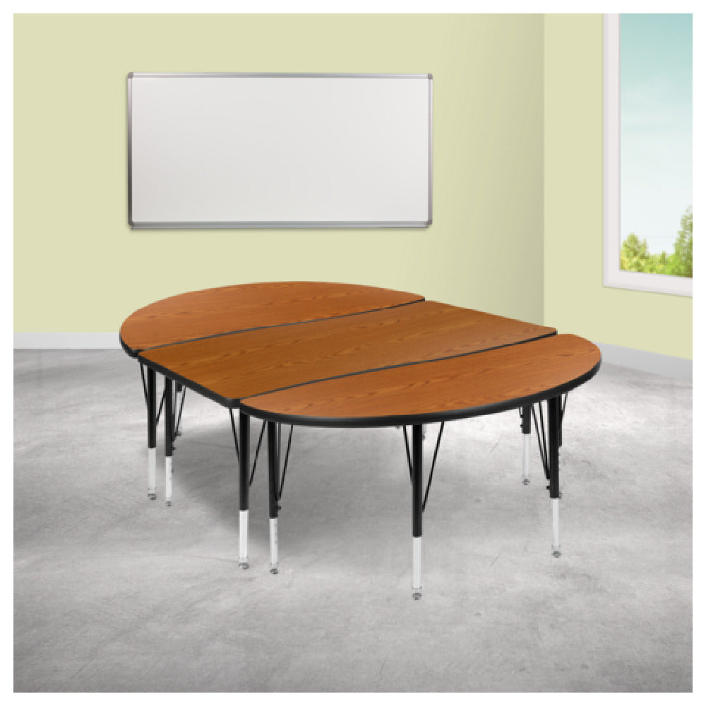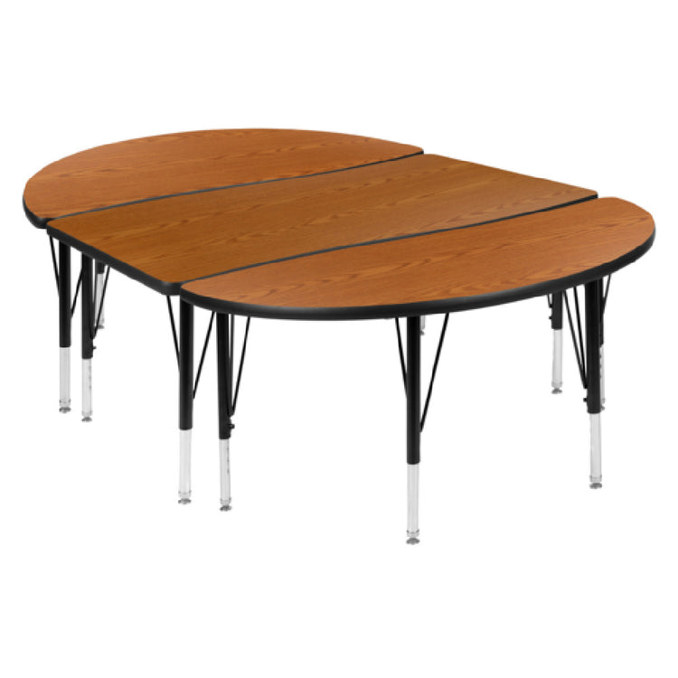 The Flash Furniture XU-GRP-A3048CON-48-OAK-T-P-GG Emmy Activity Table 2-Piece Set is a versatile addition to educational, professional, and creative environments. With dimensions of 76"W x 47-1/2"D, this table features an adjustable height ranging from 16-1/4" to 25-1/4", allowing for customization to suit different activities and user needs. The table is designed with an oval wave shape and constructed with a 1" thick thermal fused oak laminate top, known for its durability and resistance to scratches and stains, ensuring longevity in various settings. The black edge band adds an extra layer of protection and aesthetic appeal. The table's robust structure is supported by 16-gauge tubular steel legs, with black powder-coated upper legs and chrome lower legs, ensuring stability and a modern look. The inclusion of self-leveling nylon floor glides provides stability on uneven surfaces, making it ideal for dynamic environments like classrooms, workshops, or conference rooms. This activity table set is crafted to support a range of activities, from collaborative group work to individual tasks, making it a practical choice for diverse markets seeking durability, adaptability, and style in their furnishings.