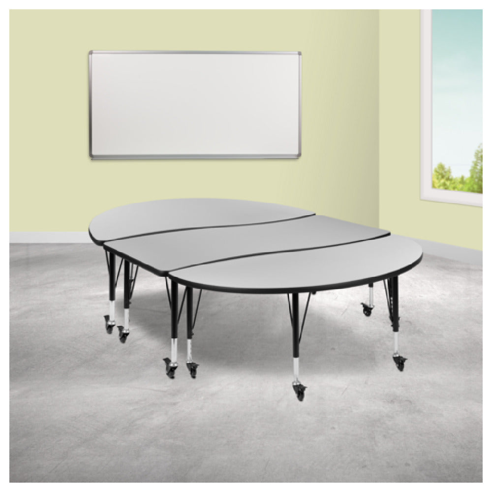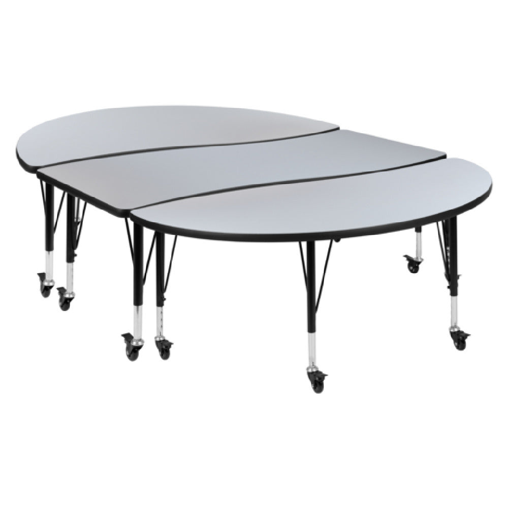 The Flash Furniture XU-GRP-A3060CON-60-GY-T-P-CAS-GG Emmy Activity Table 3-Piece Set is a versatile piece designed for dynamic environments. With dimensions of 86 inches in width and 60 inches in depth, it offers ample workspace suitable for various settings, from educational institutions to collaborative office spaces. The adjustable height feature, ranging from 17 to 25 inches, accommodates users of different heights, promoting ergonomic comfort. The table's oval wave design adds an aesthetic edge, while its 1-inch thick thermal fused gray laminate top ensures durability with a scratch and stain resistant surface, making it ideal for high-traffic areas. Encased in a black edge band, this table is supported by 16-gauge tubular steel legs, which combine black powder-coated upper legs with chrome lower legs for a sleek, modern look. The inclusion of locking casters enhances mobility and stability, allowing easy reconfiguration of space as needed. Assembly is required to set up the table, which further underscores its adaptability to various settings. The Emmy Activity Table seamlessly integrates practical functionality with a stylish design, making it an attractive choice for any setting that demands both form and function.