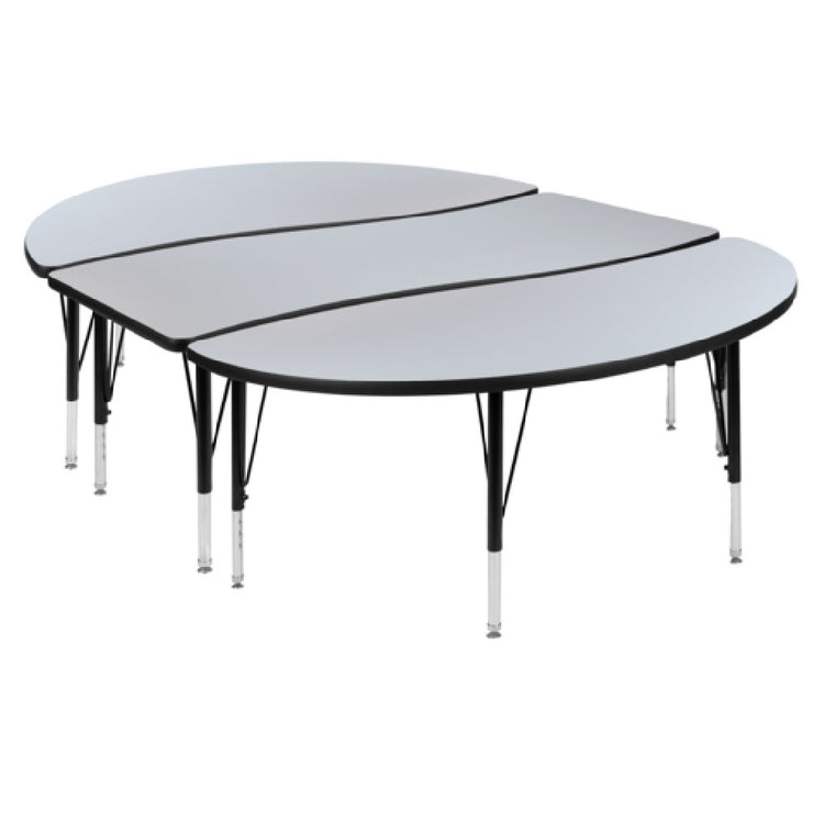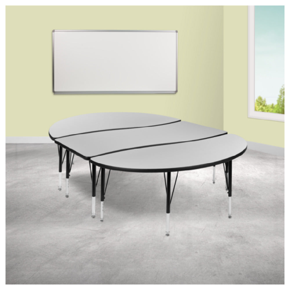 The Flash Furniture XU-GRP-A3060CON-60-GY-T-P-GG Emmy Activity Table 2-Piece Set is a versatile and robust choice for educational and professional environments, measuring 86 inches wide by 60 inches deep. This table set is designed with an adjustable height ranging from 16-1/4 inches to 25-1/4 inches, accommodating various user needs and promoting ergonomic comfort. Its unique oval wave design adds a modern aesthetic, while the 1-inch thick thermal fused gray laminate top ensures durability with a scratch and stain resistant surface, ideal for high-traffic settings. The table’s black edge banding adds a sleek finish and additional protection. Supported by 16 gauge tubular steel legs, the table boasts a sturdy construction, with black powder-coated upper legs and chrome lower legs for enhanced stability and an appealing look. The addition of self-leveling nylon floor glides allows for easy and stable placement on uneven surfaces, making this table set a practical choice for classrooms, training rooms, and collaborative workspaces. Whether accommodating group activities or individual tasks, the Emmy Activity Table 2-Piece Set delivers on both functionality and style, catering to a wide range of industry needs with its adaptable design and reliable build quality.