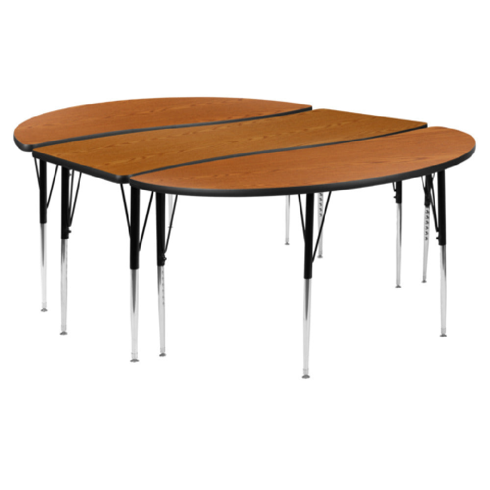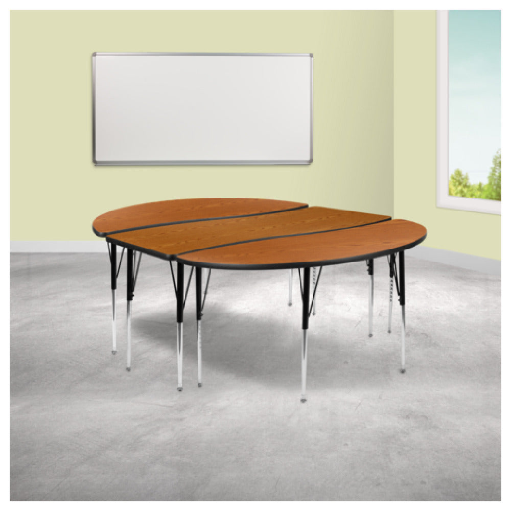 The Flash Furniture XU-GRP-A3060CON-60-OAK-T-A-GG Emmy Activity Table 2-Piece Set is a versatile and durable solution for various educational and professional environments. Measuring 86 inches in width and 60 inches in depth, this table set is designed to accommodate different needs with its adjustable height feature, ranging from 21-1/4 inches to 30-1/4 inches. The oval wave design adds a modern touch, while the 1-inch thick thermal fused oak laminate top provides a robust and aesthetically pleasing surface. This top is engineered to be both scratch and stain resistant, ensuring long-lasting use even in high-traffic areas. The table's construction includes 16 gauge tubular steel legs, with black powder coated upper legs and chrome lower legs, enhancing both stability and visual appeal. Self-leveling nylon floor glides are included to maintain stability on uneven surfaces, making it a practical choice for various flooring types. The black edge band further adds to its durability and sleek look. This table set is ideal for schools, training rooms, or collaborative office spaces, offering a blend of functionality and style suitable for a range of market segments within the educational and professional industries.