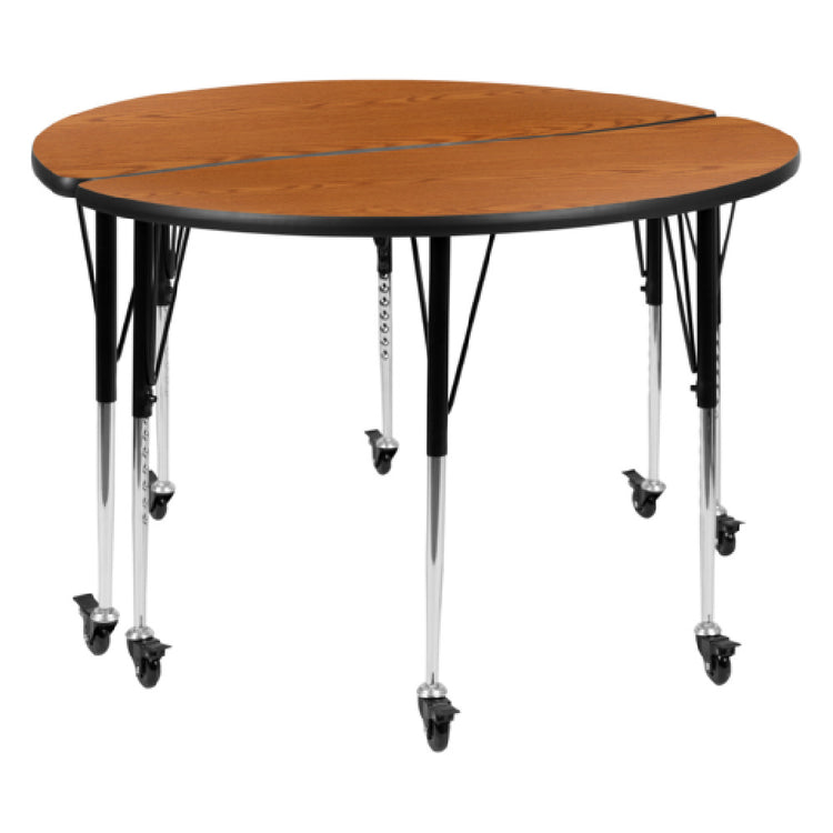 The Flash Furniture XU-GRP-A48-HCIRC-OAK-T-A-CAS-GG Emmy Activity Table 2-Piece Set is a versatile and durable workspace solution designed for various educational and professional settings. This table set features a 47-1/2" diameter circular wave design, which enhances both aesthetics and functionality, making it suitable for collaborative environments. The table height is adjustable from 22" to 30", accommodating users of different sizes and ensuring ergonomic comfort. Constructed with a 1" thick thermal fused oak laminate top, it provides a scratch and stain-resistant surface, ensuring long-lasting use. The black edge band adds an extra layer of protection and style. Supported by 16-gauge tubular steel legs, the table boasts robust stability. The upper legs are finished in a black powder coat, while the lower legs feature a chrome finish, combining durability with a sleek appearance. For added mobility, the table is equipped with locking casters, making it easy to rearrange or transport as needed. Ideal for classrooms, training rooms, or any space requiring flexible workstation arrangements, this table set combines practicality with contemporary design to meet the demands of various market segments within educational and office environments.