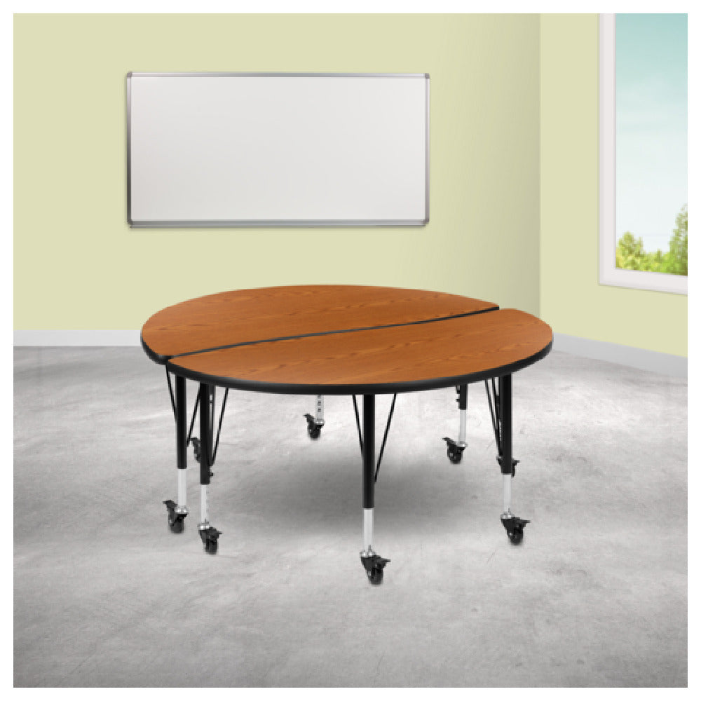The Flash Furniture XU-GRP-A48-HCIRC-OAK-T-P-CAS-GG Emmy Activity Table 2-Piece Set is a versatile piece designed to meet various needs across different segments within the educational and commercial furniture industry. This table set features a 47-1/2" diameter circular surface with a distinctive circle wave design, providing an expansive workspace for collaborative activities. The table height is adjustable, ranging from 17" to 25", accommodating users of different ages and sizes. The 1" thick thermal fused oak laminate top is engineered for durability, offering a scratch and stain resistant surface that ensures long-lasting use and easy maintenance. The table's black edge banding adds an elegant contrast to its oak finish. Constructed with 16 gauge tubular steel legs, the table promises robust support, enhanced by black powder coated upper legs and chrome lower legs for an appealing, modern look. The inclusion of locking casters adds mobility, making it easy to reposition the table as needed within a space. Assembly is required, allowing for convenient shipping and handling. This table set is ideal for classrooms, training rooms, or any setting that benefits from adaptable furniture solutions.