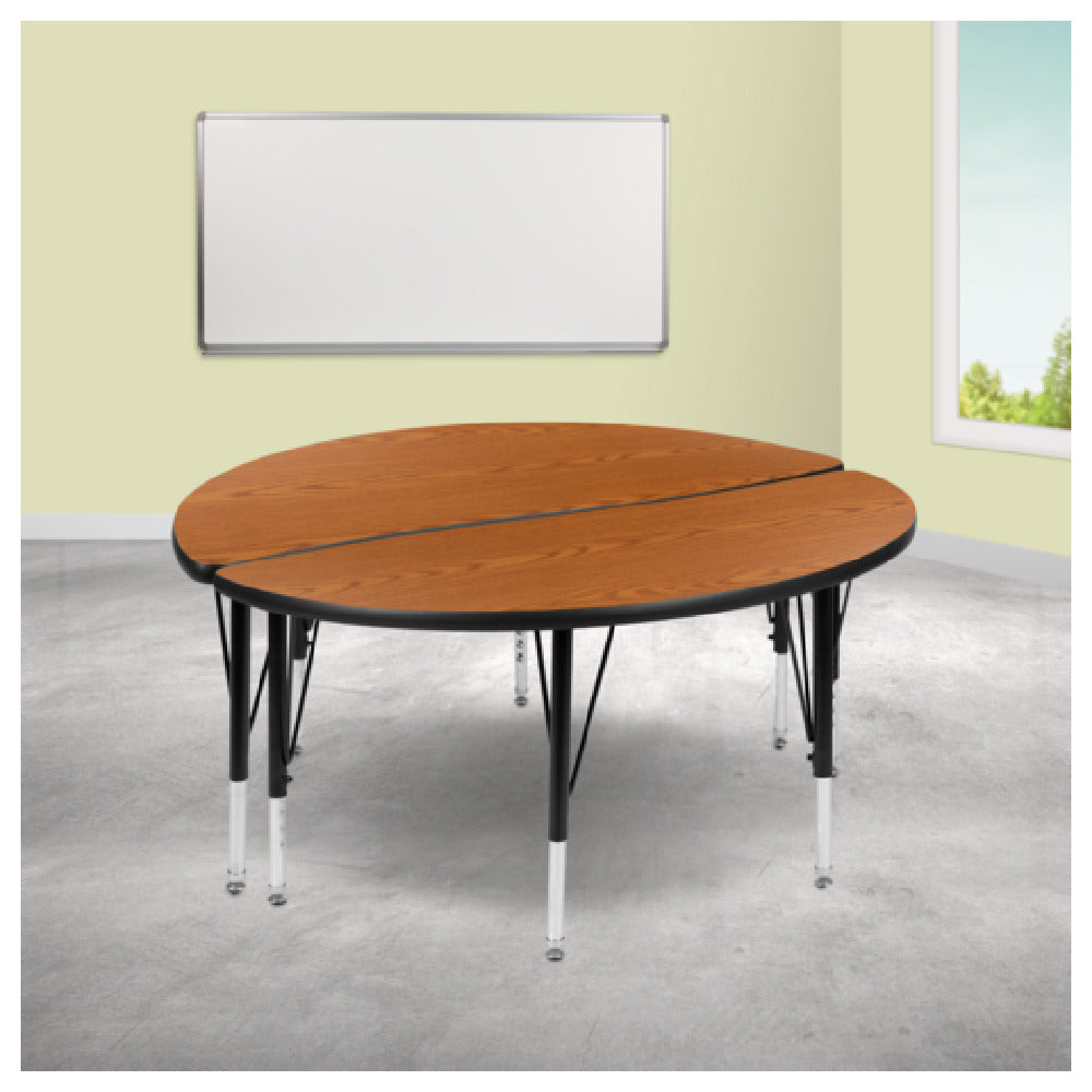 The Flash Furniture XU-GRP-A48-HCIRC-OAK-T-P-GG Emmy Activity Table 2-Piece Set is a versatile and durable choice for various educational and professional environments. Measuring 47-1/2 inches in diameter, the table features an adjustable height range from 16-1/4 inches to 25-1/4 inches, accommodating diverse needs and preferences. Its 1-inch thick thermal fused oak laminate top provides a robust and resilient surface that is both scratch and stain resistant, ensuring longevity in high-traffic settings. The table's design includes a distinctive circle wave pattern, adding a touch of elegance to its functionality. Constructed with 16-gauge tubular steel legs, this table is built for stability and strength. The upper legs are finished with a black powder coating, while the lower legs are chrome-plated, offering both aesthetic appeal and durability. For additional convenience, the table is equipped with self-leveling nylon floor glides, which ensure stability on uneven surfaces and protect flooring from damage. This Emmy Activity Table set is ideal for classrooms, conference rooms, or collaborative workspaces, providing a reliable and adaptable solution with its adjustable height and robust construction.