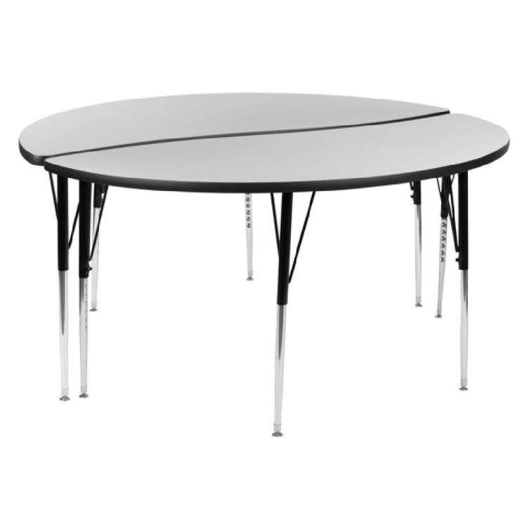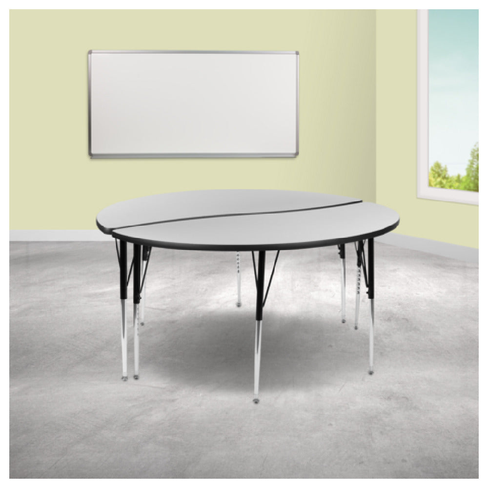 The Flash Furniture XU-GRP-A60-HCIRC-GY-T-A-GG Emmy Activity Table 2-Piece Set is a versatile and durable furniture solution, ideal for educational and professional environments. With a circular design measuring 60 inches in diameter, it provides ample surface area for group activities or meetings. This table set features an adjustable height ranging from 21-1/4 inches to 30-1/4 inches, allowing customization to suit various user needs and settings. The tabletop is constructed with a 1-inch thick thermal fused gray laminate, renowned for its scratch and stain resistance, ensuring longevity and easy maintenance. The black edge band enhances its aesthetic appeal while offering additional protection. Supported by 16-gauge tubular steel legs, the table exhibits robust stability. The upper legs are black powder-coated, while the chrome lower legs add a sleek, modern touch. Designed with self-leveling nylon floor glides, it provides stability on uneven surfaces, reducing the risk of wobbling. This Emmy Activity Table is an exceptional choice for schools, offices, and collaborative workspaces, combining functionality and style to meet diverse demands within the industry.