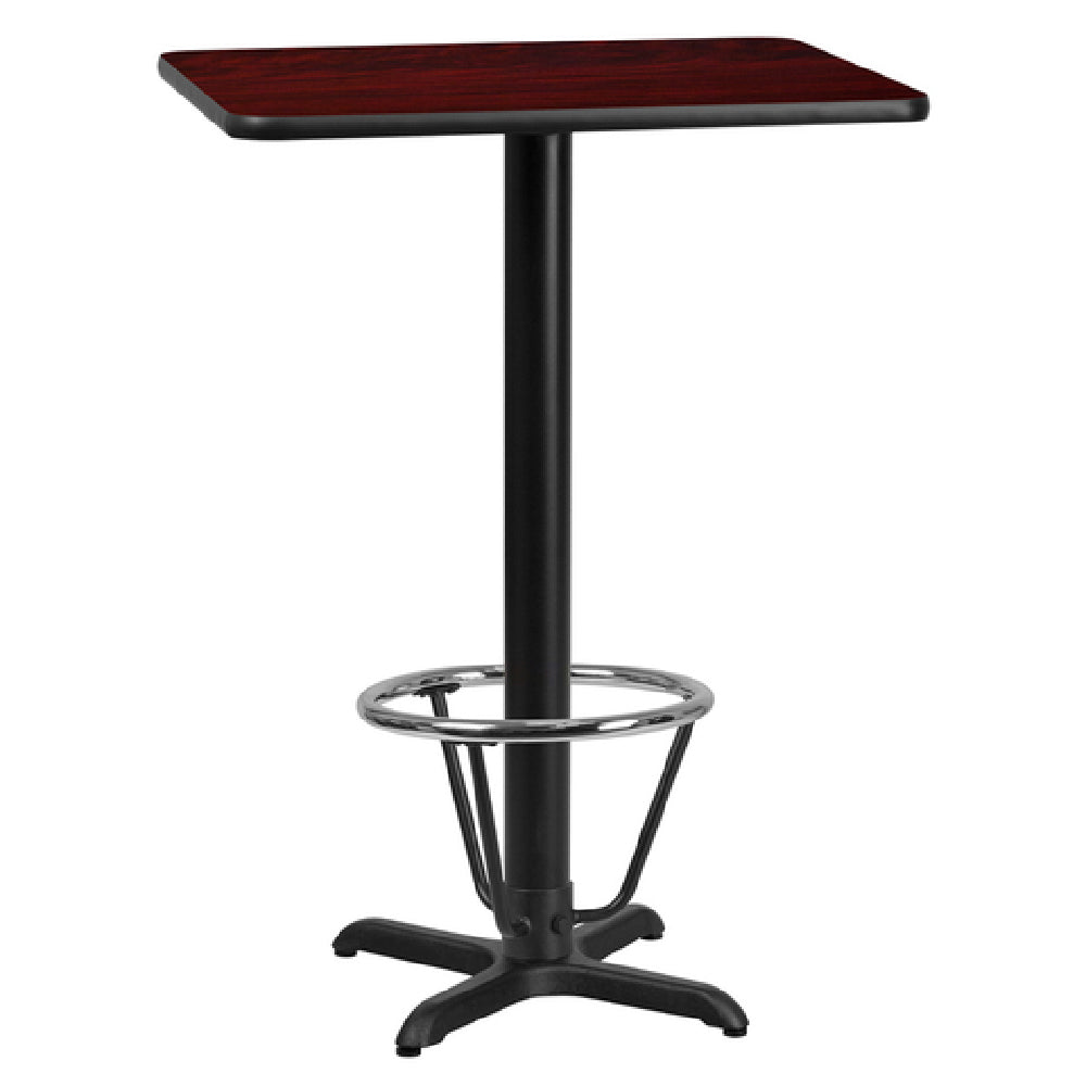 The Flash Furniture XU-MAHTB-2430-T2222B-3CFR-GG Table is a meticulously crafted piece, ideal for commercial environments that require durable and stylish furnishings. Standing at a bar height of 43-1/8 inches, this table features a rectangular top measuring 30 inches in width and 24 inches in depth. The top is made from Medium-Density Fiberboard (MDF) with a melamine core and is finished with a mahogany laminate, providing both aesthetic appeal and resilience. A 1-1/8 inch thick tabletop is edged with black PVC T-mold for additional protection against wear. The table is supported by a sturdy 22-inch by 22-inch x-base and a 3-inch diameter cast iron column, both with a sleek black powder-coated finish for enhanced durability. A 16-inch diameter chrome foot ring adds a touch of elegance while providing practical support for users. Designed for commercial use, this table is shipped in four boxes and requires assembly upon delivery. In-stock items are typically shipped within 24 hours, ensuring prompt delivery. This versatile table is suitable for a variety of settings including restaurants, cafes, and bars, where its combination of functionality and modern design can meet diverse customer needs.