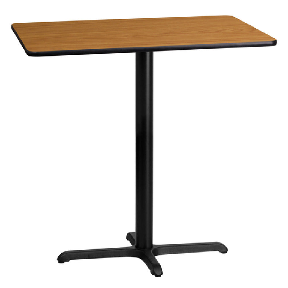 Flash Furniture XU-NATTB-2442-T2230B-GG Table 42"W x 24"D x 43-1/8"H Bar Height is a meticulously crafted piece designed for commercial use. With its dimensions of 42 inches in width, 24 inches in depth, and standing at a bar height of 43-1/8 inches, this table is perfectly suited for bustling bar environments. The rectangular table boasts a 1-1/8 inch thick MDF construction with a melamine core, providing durability with a sleek natural laminate finish. Its edges are protected by a black PVC T-mold edge, ensuring longevity and resistance to wear. The pre-welded top plate adds to the table's sturdiness, while the 22 x 30 inch x-base ensures stability on any surface. A 3-inch diameter cast iron column with a black powder-coated finish further enhances its resilience, making it ideal for heavy-duty commercial settings. Assembly is required, and the product ships in three boxes, with in-stock items typically dispatched within 24 hours. Tailored for various segments within the hospitality industry, this table combines practicality with style, making it a versatile choice for bars, restaurants, and cafes aiming to elevate their interior design with reliable, high-quality furniture.