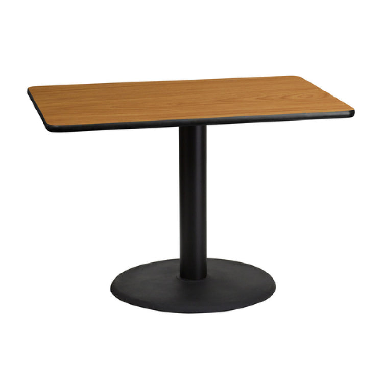 The Flash Furniture XU-NATTB-3042-TR24-GG Table 42"W x 30"D x 31-1/8"H Dining Height stands as a robust and versatile choice for commercial environments requiring reliable and efficient furniture solutions. This rectangular table features a 1-1/8" thick MDF core with a durable melamine laminate finish, providing a natural aesthetic that complements a variety of settings. The table's black PVC T-mold edge ensures additional protection against wear and tear. The structure is reinforced with a pre-welded top plate for added stability, making it a dependable option in high-traffic areas. Supporting the table is a sturdy 24" diameter base, anchored by a 4" diameter cast iron column finished with a black powder coating, which resists scratches and adds a sleek look. The table is designed for easy assembly, shipped in three separate boxes, and typically ready for dispatch within 24 hours for in-stock items. Its design and construction make it a perfect fit for a range of segment markets, including restaurants, cafes, and other dining establishments, offering a balance of style, functionality, and durability tailored to the demands of commercial use.