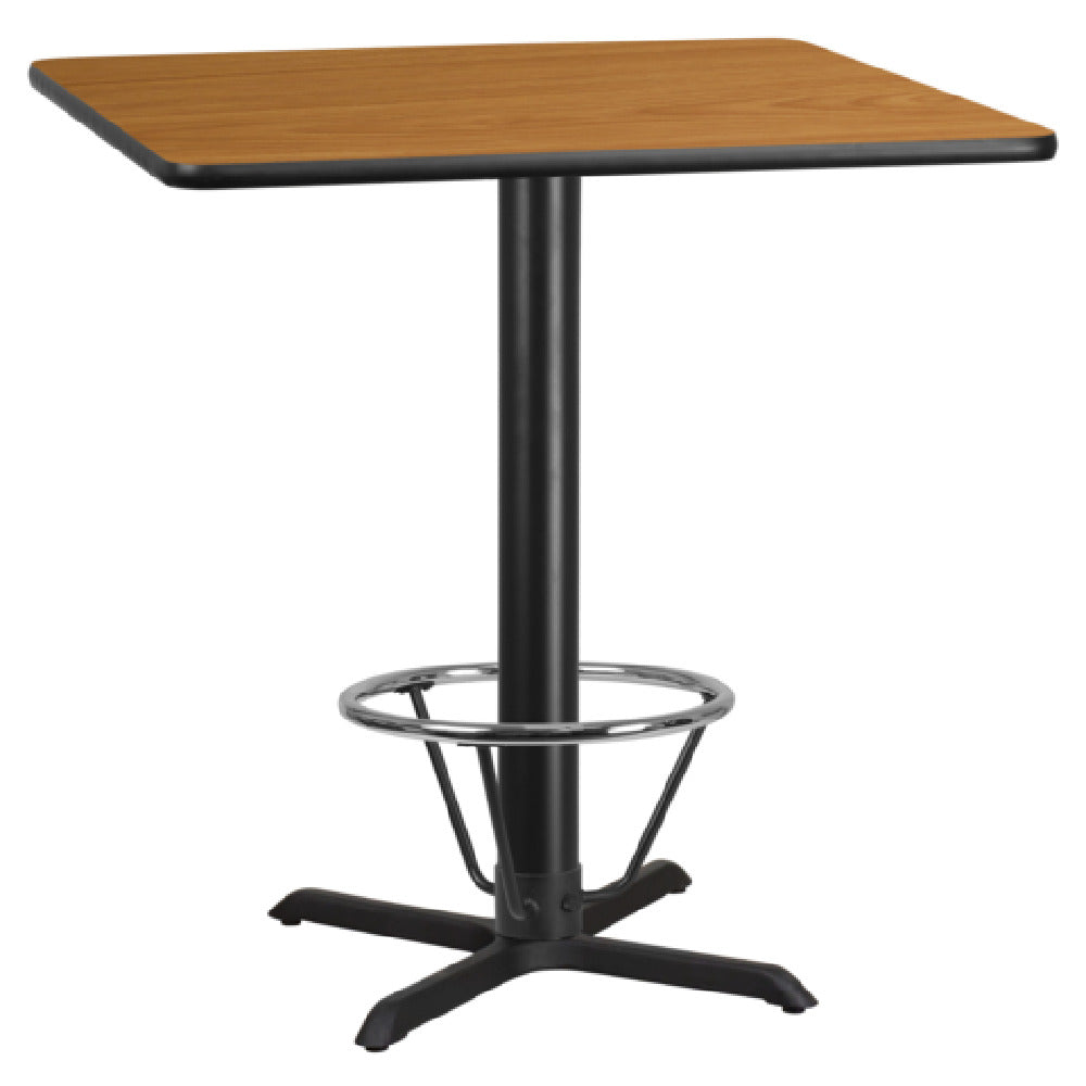 The Flash Furniture XU-NATTB-4242-T3333B-4CFR-GG Stiles Table is a meticulously crafted piece designed for commercial use, standing at a bar height with dimensions of 42"W x 42"D x 43-1/8"H. This square table features a 1-1/8" thick MDF top with a melamine core, finished in a natural laminate, offering durability and a sleek appearance. The edges are reinforced with a black PVC T-mold, enhancing the table's resilience against wear and tear. The table is supported by a robust 33" x 33" x-base and a 4" diameter cast iron column, both finished in a black powder coating for added strength and stability. A chrome foot ring with a diameter of 19-1/2" provides additional comfort and functionality, making it a versatile choice for various settings, from bustling cafes to modern office spaces. The pre-welded top plate ensures easy assembly and long-lasting use. This table's unique blend of style and durability makes it an excellent investment for businesses looking to enhance their space with functional and aesthetically pleasing furniture.