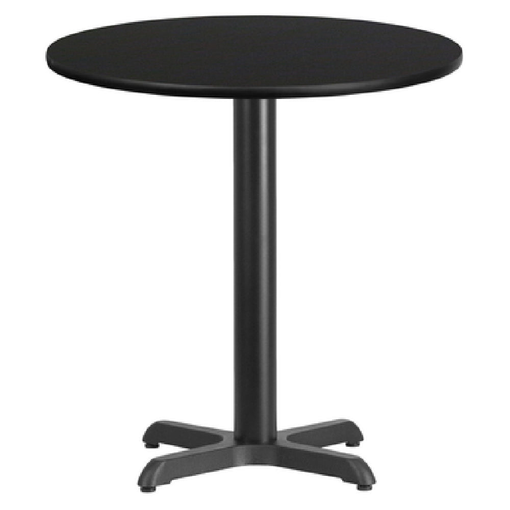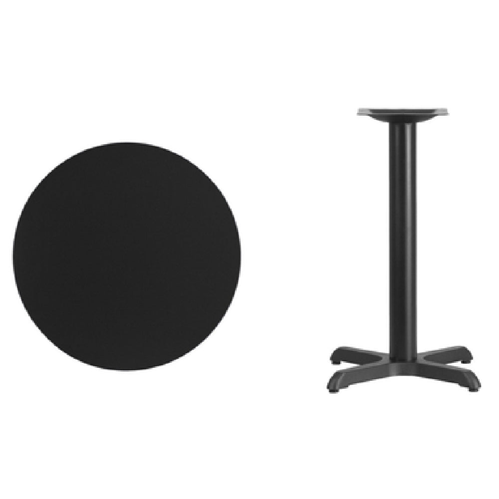 Flash Furniture XU-RD-24-BLKTB-T2222-GG Table 24" Dia. X 31-1/8"H Dining Height is a meticulously designed piece tailored for commercial use. This round table boasts a 24-inch diameter with a dining height of 31-1/8 inches, making it a practical solution for various seating arrangements. Its top is 1-1/8 inches thick, constructed from medium-density fiberboard (MDF) with a melamine core that is both durable and aesthetically pleasing. The surface is finished with a black laminate, while the edges are protected with a black PVC T-mold, ensuring both resilience and a sleek appearance. A pre-welded top plate secures the table firmly, supported by a sturdy 22" x 22" x-base. The table's 3-inch diameter cast iron column is finished with black powder coating, enhancing its durability and resistance to wear. This item requires assembly and is shipped in three boxes, with in-stock items typically dispatched within 24 hours. The Flash Furniture XU-RD-24-BLKTB-T2222-GG Table is an ideal addition for dining environments in cafés, restaurants, and other commercial settings, combining functional design with robust materials to meet the demands of high-traffic areas.