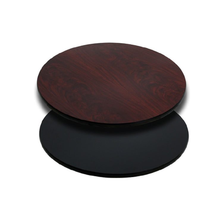 The Flash Furniture XU-RD-24-MBT-GG Table Top Round 24" Dia. is a versatile furniture piece designed to cater to diverse commercial settings. This table top features a 24-inch diameter, making it suitable for both compact and spacious environments. The 1-1/8-inch thick design ensures durability and stability, essential for high-traffic commercial use. A unique aspect of this product is its reversible feature, offering a choice between two sophisticated finishes: black laminate on one side and mahogany laminate on the other, allowing easy adaptation to different decor styles. The black T-mold edge adds an extra layer of protection, preventing chipping and extending the product's lifespan. Constructed with a high impact melamine core, this table top is built to withstand the demands of commercial use, ensuring long-lasting performance. Ideal for restaurants, cafes, and other hospitality venues, the Flash Furniture XU-RD-24-MBT-GG Table Top provides a practical and stylish solution for businesses looking to enhance their dining spaces. In-stock items are available for quick dispatch, shipping within 24 hours, making this a convenient choice for businesses seeking timely delivery.