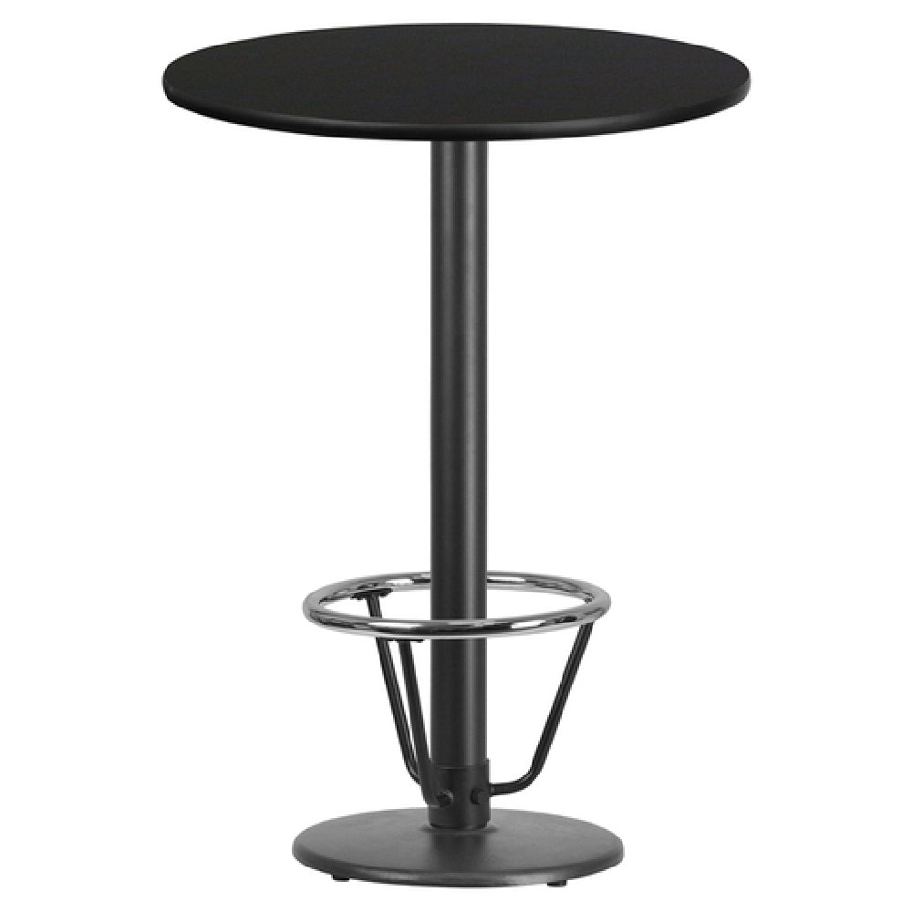 The Flash Furniture XU-RD-30-BLKTB-TR18B-3CFR-GG Table 30" Dia. x 43-1/8"H Bar Height is a versatile piece designed for commercial settings, featuring a round 30-inch diameter top with a substantial thickness of 1-1/8 inches. The table's top is constructed from medium-density fiberboard (MDF) with a durable melamine core and a sleek black laminate finish, providing both style and resilience. A black PVC T-mold edge enhances the table's durability by protecting its edges. This bar-height table boasts a pre-welded top plate, ensuring structural stability and ease of assembly. The 18-inch diameter base supports a 3-inch diameter cast iron column, which is coated with a black powder finish for added protection against wear. At the foot of the table, a 16-inch diameter chrome foot ring offers both functionality and a touch of elegance, making it comfortable for patrons. This table is shipped in four boxes, and assembly is required. Ideal for bars, restaurants, and event spaces, it typically ships within 24 hours when in stock, ensuring quick delivery for commercial use. The table's design emphasizes durability and functionality, making it a valuable choice for businesses in the hospitality industry.
