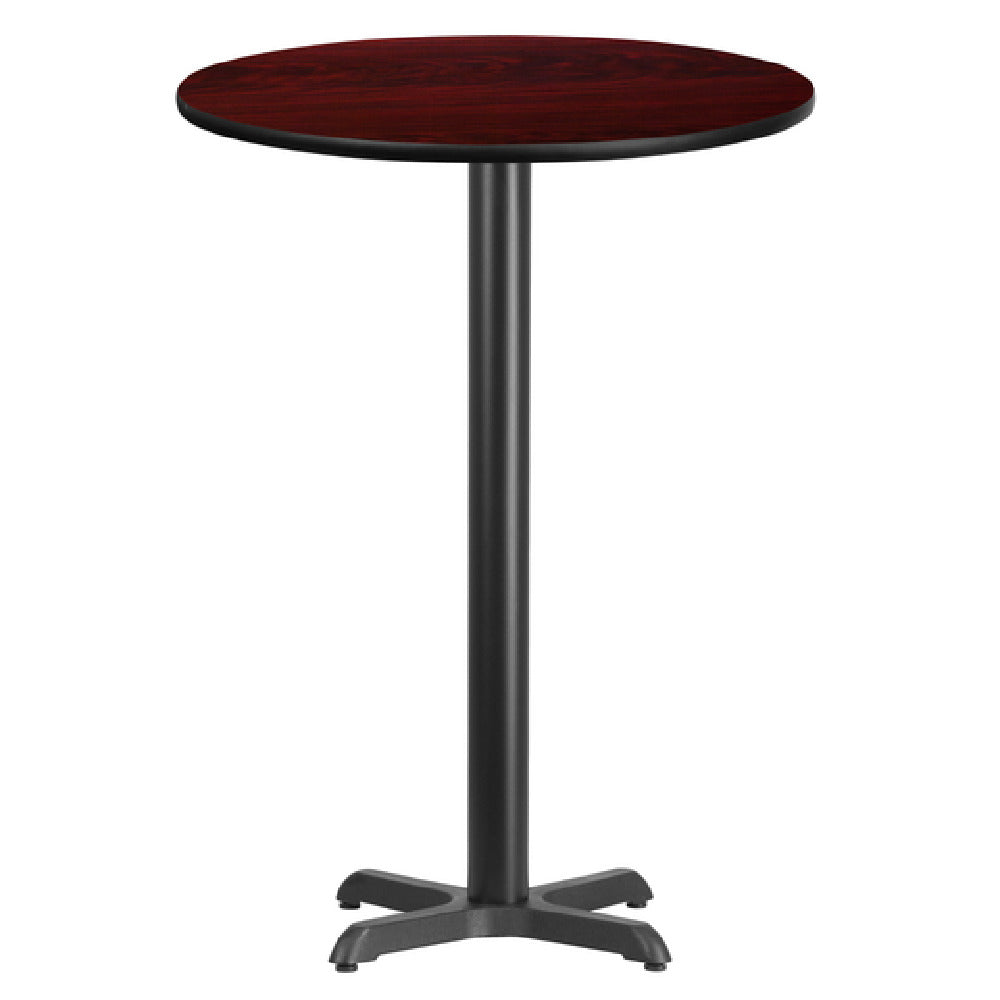 The Flash Furniture XU-RD-30-MAHTB-T2222B-GG Table 30" Dia. x 43-1/8"H Bar Height is a robust and versatile piece designed for commercial environments, offering a sophisticated blend of durability and style. With a round top measuring 30 inches in diameter and a height of 43-1/8 inches, this bar-height table features a 1-1/8 inch thick top made from MDF with a melamine core, providing a sturdy and reliable surface for various uses. The mahogany laminate finish adds a touch of elegance, while the black PVC T-mold edge ensures lasting durability. A pre-welded top plate enhances stability, complementing the 22 x 22 inch x-base. The 3-inch diameter cast iron column, finished with black powder coating, provides further strength and resilience. Designed to meet the demands of commercial use, this table requires assembly and is shipped in three boxes, with in-stock items typically dispatched within 24 hours. Its design and construction make it a practical choice for different market segments within the hospitality industry, including bars, restaurants, and event venues, where both aesthetics and functionality are paramount.