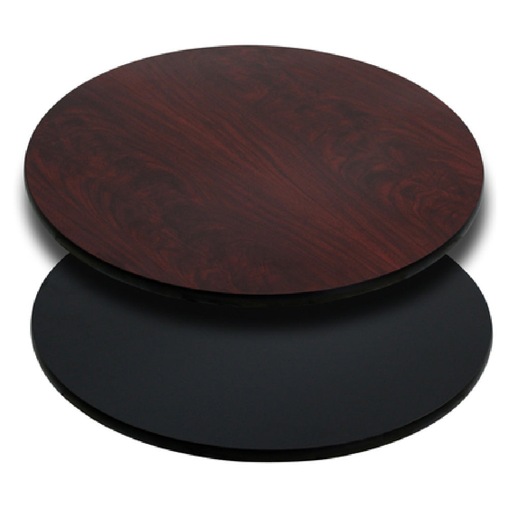 The Flash Furniture XU-RD-30-MBT-GG Table Top Round 30" Dia. is a versatile and durable choice for commercial settings. This table top features a 30-inch diameter and is 1-1/8 inches thick, providing a robust and reliable surface for various uses. One of its standout features is its reversible design, offering a choice between a sleek black laminate finish on one side and an elegant mahogany laminate on the other. This dual-finish flexibility caters to different aesthetic preferences and interior designs, making it suitable for diverse market segments within the food service and hospitality industries. The table top is equipped with a black T-mold edge, adding to its durability by protecting the edges from potential damage during frequent use. Built with a high-impact melamine core, this table top is engineered for resilience and longevity in busy environments. Designed specifically for commercial use, the product is available for quick shipping within 24 hours, ensuring timely availability for businesses in need of prompt solutions to their furnishing requirements. The Flash Furniture XU-RD-30-MBT-GG stands out for its combination of practicality and aesthetic versatility, making it an excellent option for restaurants, cafes, and other commercial spaces seeking reliable and adaptable furniture solutions.