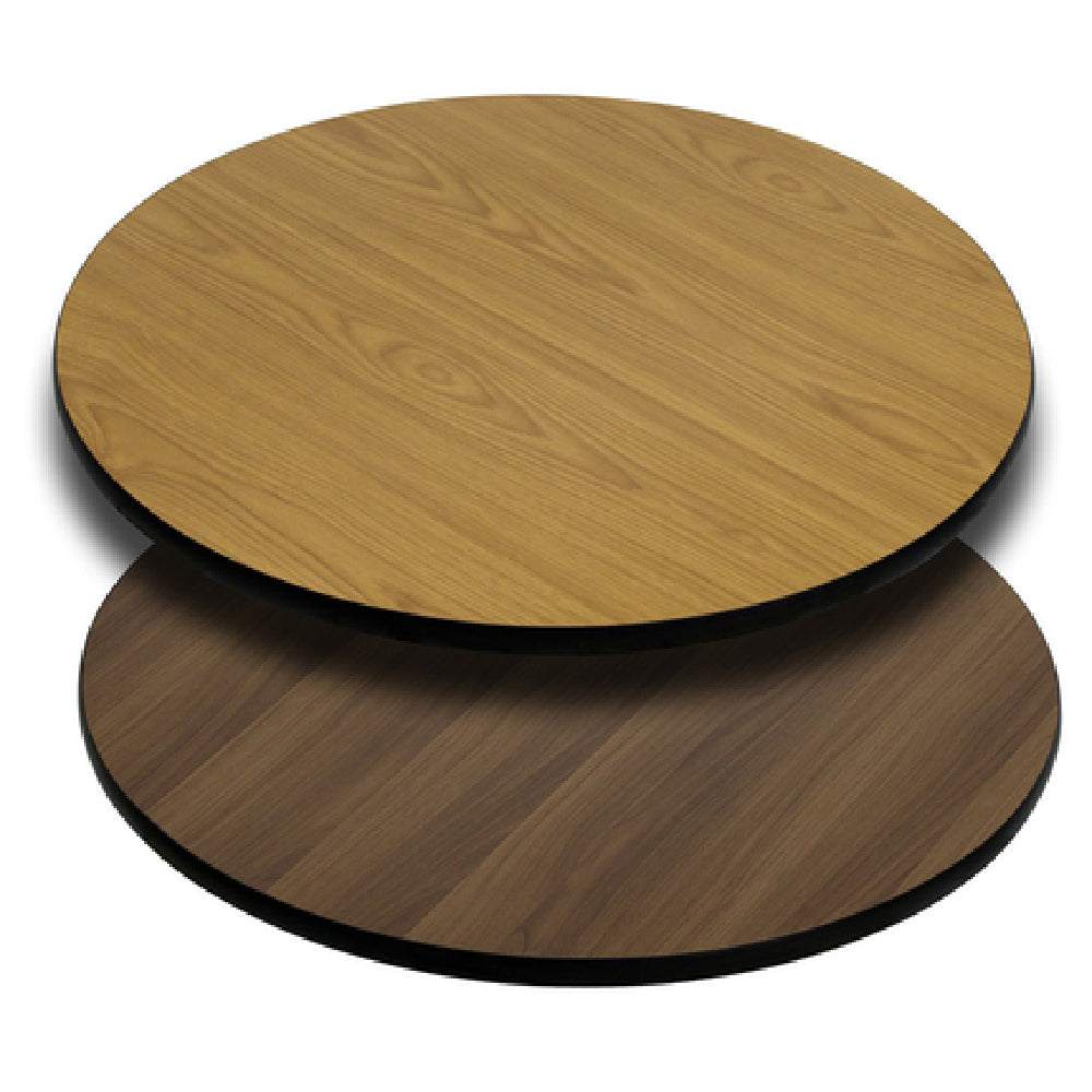 Flash Furniture XU-RD-30-WNT-GG Table Top Round 30" Dia. stands out as a versatile and durable solution for various commercial environments. Measuring 30 inches in diameter and 1-1/8 inches thick, this table top is crafted with a high-impact melamine core, ensuring longevity and resistance to wear. The unique reversible design offers two aesthetic options: a natural laminate on one side and a walnut laminate on the other, catering to diverse decor preferences. The black T-mold edge not only provides a sleek finish but also adds to the table top's durability by protecting the edges from potential damage. Engineered for commercial use, it's an ideal choice for restaurants, cafes, and conference rooms seeking reliable and adaptable furniture solutions. The Flash Furniture XU-RD-30-WNT-GG Table Top is readily available, with in-stock items shipping within 24 hours, ensuring quick and efficient service for businesses with immediate needs. Its thoughtful design and robust construction make it a practical investment for any establishment looking to enhance their space with functional and stylish furniture. This table top's blend of functionality and aesthetic flexibility highlights its unique value proposition in the competitive furniture market.
