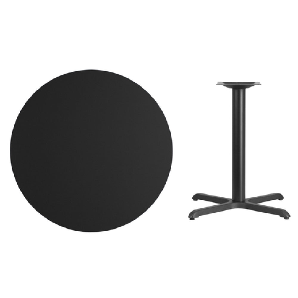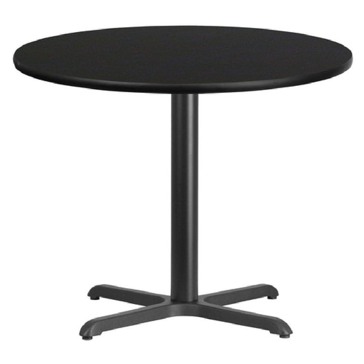 The Flash Furniture XU-RD-36-BLKTB-T3030-GG Table 36" Dia. X 31-1/8"H Dining Height is a versatile piece designed for commercial use, combining durability with sleek aesthetics. Featuring a round top measuring 36 inches in diameter and crafted from medium-density fiberboard (MDF) with a melamine core, this table ensures both sturdiness and a smooth surface. The black laminate finish enhances its modern appeal, complemented by a black PVC T-mold edge that provides protective and aesthetic benefits. The table stands at a dining height of 31-1/8 inches, supported by a robust 30" x 30" x-base. This base comprises a 3-inch diameter cast iron column with a black powder-coated finish, ensuring stability and resistance to daily wear. The pre-welded top plate simplifies assembly, although it is important to note that some assembly is required. The table is shipped in three boxes, which typically dispatch within 24 hours, ensuring a quick delivery for in-stock items. Its comprehensive design and professional-grade construction make it a practical choice for restaurants, cafes, and other hospitality settings, offering reliable performance and an appealing aesthetic for various dining environments.
