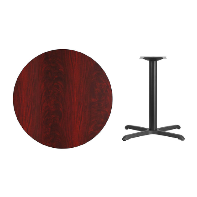 Flash Furniture XU-RD-36-MAHTB-T3030-GG Table 36" Dia. X 31-1/8"H Dining Height is a sophisticated and durable furnishing solution designed for commercial environments. This round table boasts a 36-inch diameter and a height of 31-1/8 inches, making it suitable for dining purposes. The table top is constructed from a 1-1/8-inch thick MDF with a melamine core, ensuring both sturdiness and longevity. It features a mahogany laminate finish, providing an elegant appearance that complements a variety of decor styles. The edge of the table is reinforced with a black PVC T-mold, adding an extra layer of protection against wear and tear. Ensuring stability, the table is supported by a pre-welded top plate and a robust 30" x 30" x-base. The 3-inch diameter cast iron column is finished with a black powder coating, enhancing its durability and resistance to corrosion. This table is shipped in three boxes and requires assembly upon receipt. Ideal for restaurants, cafes, and other dining venues, this table combines functionality with an attractive design. Items in stock are typically shipped within 24 hours, ensuring prompt delivery to meet the demands of commercial use.