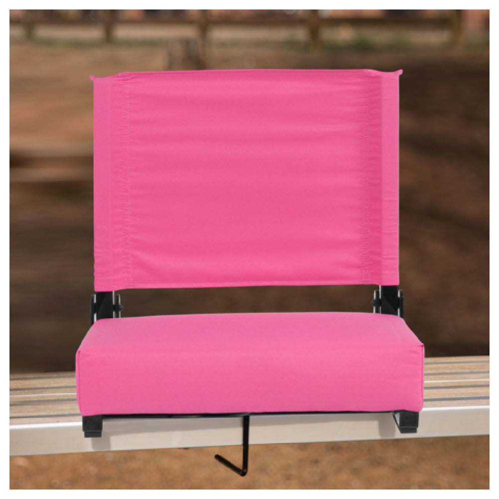 The Flash Furniture XU-STA-PK-GG Grandstand Ultra-Padded Comfort Seat is a versatile seating solution with a robust weight capacity of 500 lbs, making it suitable for various audiences, including sports enthusiasts and event attendees. Crafted with a canvas seat and back cover, this seat offers both durability and comfort, enhanced by its ultra-padded design. The CA117 fire retardant foam underscores the product's commitment to safety standards, ideal for adult users. Its foldable nature ensures easy storage and portability, complemented by a lightweight structure and a convenient carrying handle bar with a grip. The inclusion of a bleacher hook and a rubber bottom ensures stability and protection during use. Featuring a sleek black aluminum frame finish, the Grandstand Ultra-Padded Comfort Seat is designed for both indoor and outdoor environments, offering versatility across different settings. Available in a vibrant pink color, this product typically ships within 24 hours for in-stock items, catering to users' immediate needs. The blend of technical features such as weight capacity, fire safety, portability, and adaptable design positions this seat as a prime choice for individuals seeking reliable and comfortable seating options across various indoor and outdoor applications.