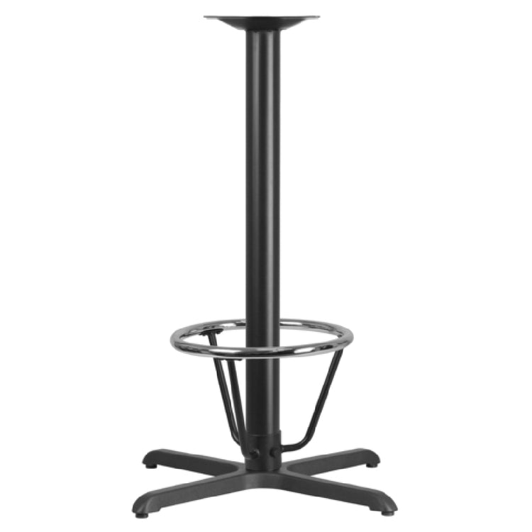 The Flash Furniture XU-T3030-BAR-3CFR-GG Table Base is a highly versatile and robust choice for various commercial settings, including restaurants, bars, and cafes. Measuring 30" x 30" x 42"H, this bar-height table base features an x-base design that provides exceptional stability. Its 3" diameter column is complemented by a 16" diameter chrome foot ring, ensuring both durability and style. The table base is constructed from cast iron with a black powder-coated finish, promising longevity and resistance to wear. One of its key advantages is the pre-welded top plate designed to fit 24" to 36" round or square table tops, offering flexibility for different table designs and sizes. This product is engineered for commercial use, aligning with the robust demands of high-traffic environments. Assembly is required, and the item is shipped in three boxes, typically within 24 hours of ordering, ensuring swift availability. Its compatibility with various table tops and durable construction make it a practical and adaptable solution for businesses seeking reliable and aesthetically pleasing furniture options.