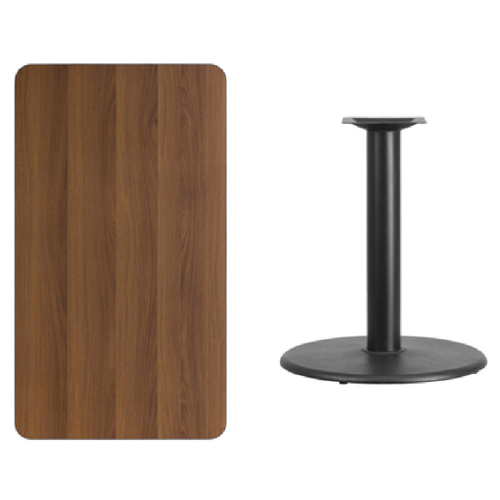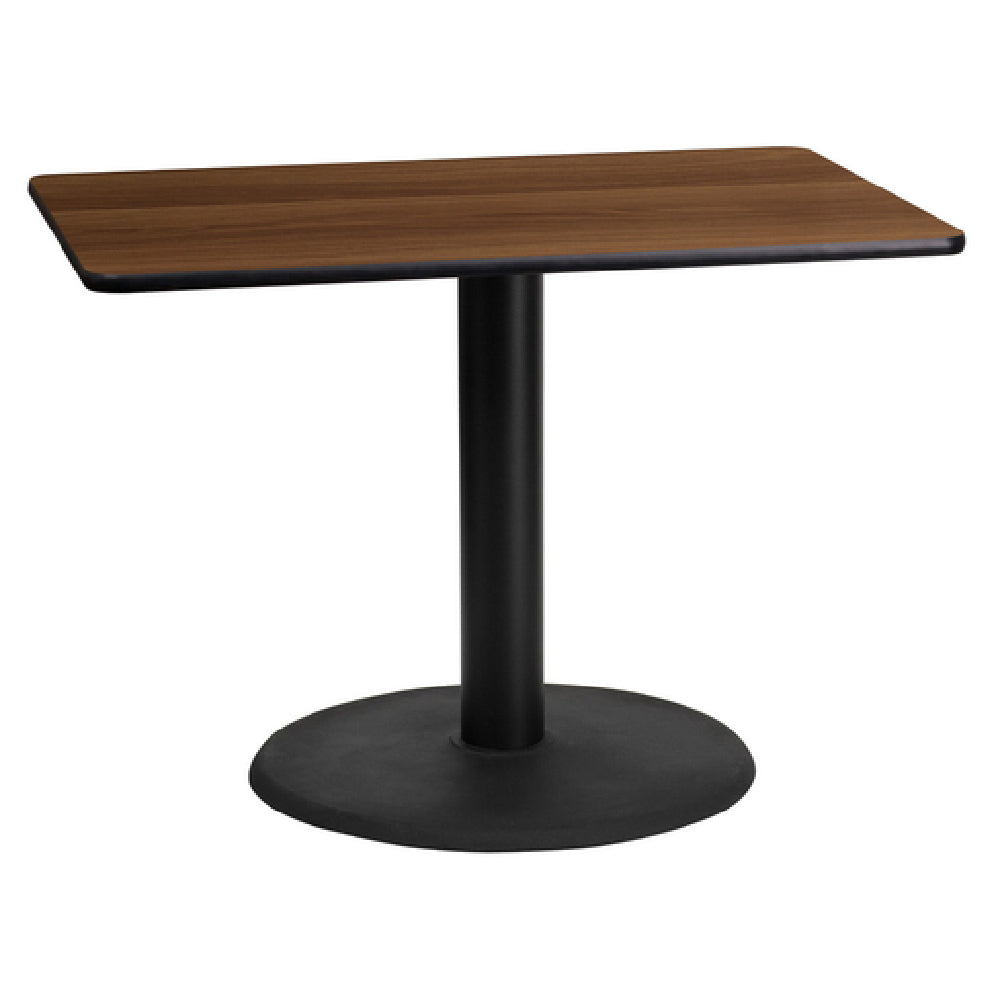 The Flash Furniture XU-WALTB-2442-TR24-GG Table is a meticulously designed piece of furniture, crafted for both style and function. This dining height table measures 42 inches in width, 24 inches in depth, and stands at 31-1/8 inches tall, making it an ideal choice for various dining setups. The table features a 1-1/8 inch thick MDF with a durable melamine core, topped with an elegant walnut laminate finish that adds a touch of sophistication to any space. A black PVC T-mold edge enhances its durability while providing a sleek, finished look. The table's design incorporates a pre-welded top plate, ensuring stability and longevity in use. Supported by a 24-inch diameter base and a 4-inch diameter cast iron column, it boasts a black powder-coated finish that offers both aesthetic appeal and resistance to wear. Designed for commercial use, this table requires assembly and is shipped in three boxes. Its robust construction and elegant finish make it an excellent choice for restaurants, cafes, and other dining establishments seeking a blend of functionality and style. The product is readily available, with in-stock items typically shipping within 24 hours, ensuring prompt delivery for businesses in need of quality furniture solutions.