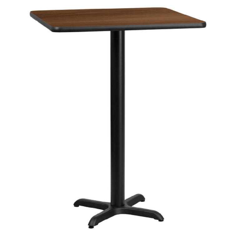 The Flash Furniture XU-WALTB-3030-T2222B-GG Table is a meticulously designed piece of commercial furniture, measuring 30"W x 30"D x 43-1/8"H, ideal for bar-height settings. Its square tabletop is constructed from MDF with a melamine core, ensuring a durable and stable surface, and is finished with a walnut laminate for a sophisticated appearance. The table's black PVC T-mold edge not only enhances its aesthetic appeal but also provides additional protection against wear and tear. It features a pre-welded top plate for added stability. The 22" x 22" x-base is complemented by a 3" diameter cast iron column with a black powder-coated finish, offering a robust support structure designed for commercial use. This table is shipped in three boxes, with assembly required, and is typically available for shipping within 24 hours of order placement. Its construction and design make it suitable for a variety of segments within the hospitality industry, from bustling bars to intimate dining settings, providing a blend of functionality and style essential for high-traffic environments.