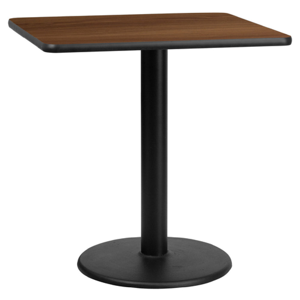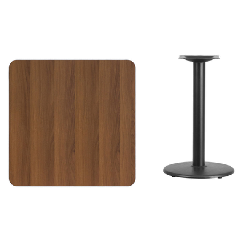 The Flash Furniture XU-WALTB-3030-TR18-GG Table 30"W X 30"D X 31-1/8"H Dining Height is a meticulously crafted piece tailored for diverse commercial environments. This square table, with dimensions of 30 inches in width, 30 inches in depth, and an overall height of 31-1/8 inches, is designed to accommodate various dining settings. Featuring a 1-1/8 inch thick MDF with a melamine core, it boasts a walnut laminate finish that adds a refined touch to any space. The durability is enhanced by a black PVC T-mold edge, protecting against wear and tear. The table's pre-welded top plate ensures stability, while the 18-inch diameter base provides a robust foundation. Supporting this is a 3-inch diameter cast iron column, finished with black powder coating for added resilience. Shipped in three boxes and requiring assembly, the table is designed for commercial use, making it a versatile choice for restaurants, cafes, and dining establishments. Its availability for immediate dispatch, typically within 24 hours for in-stock items, adds to its appeal for businesses needing quick solutions. This table embodies a blend of aesthetics and functionality, making it a valuable addition to any commercial dining setup.
