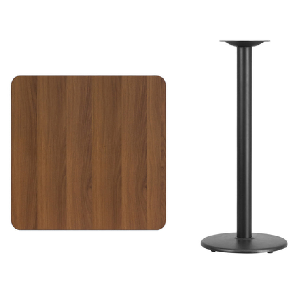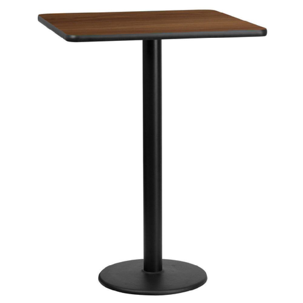 The Flash Furniture XU-WALTB-3030-TR18B-GG Table 30"W X 30"D X 43-1/8"H Bar Height is a square table meticulously crafted for commercial environments. Its dimensions of 30 inches in width, 30 inches in depth, and a bar height of 43-1/8 inches make it ideal for a variety of settings, from bustling cafes to elegant bars. The tabletop is constructed with a 1-1/8 inch thick MDF with a melamine core, offering both durability and a sophisticated walnut laminate finish that complements diverse interior décors. The black PVC T-mold edge ensures resilience against wear and tear, enhancing its longevity in high-traffic areas. This table's stability is reinforced by a pre-welded top plate and an 18-inch diameter base, supported by a 3-inch diameter cast iron column with a sleek black powder coated finish. Designed with functionality and aesthetics in mind, it accommodates the fast-paced demands of commercial use. Although assembly is required, the table is shipped in a conveniently organized package of three boxes and is typically dispatched within 24 hours for in-stock items. The Flash Furniture XU-WALTB-3030-TR18B-GG Table is an exemplary choice for those seeking a blend of style, robustness, and practicality in their business environments.