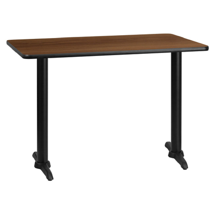 The Flash Furniture XU-WALTB-3042-T0522-GG Table is a versatile piece, tailored for commercial settings demanding durability and style. This rectangular table boasts dimensions of 42"W x 30"D x 31-1/8"H, making it suitable for dining height arrangements. Its robust construction features a 1-1/8" thick MDF with a melamine core, ensuring both sturdiness and longevity. The walnut laminate finish, complemented by a black PVC T-mold edge, provides an elegant and modern aesthetic. The table is supported by a pre-welded top plate and two 5" x 22" T-bases, ensuring stability and ease of use. A 3" diameter cast iron column with a black powder-coated finish further enhances its durability, making it ideal for high-traffic environments. While assembly is required, the table is designed for straightforward setup. Shipped in five boxes, in-stock items typically dispatch within 24 hours, ensuring quick delivery for commercial enterprises seeking to efficiently furnish their spaces. This table is an excellent choice for restaurants, cafes, and other dining establishments looking for a reliable and stylish furnishing solution.