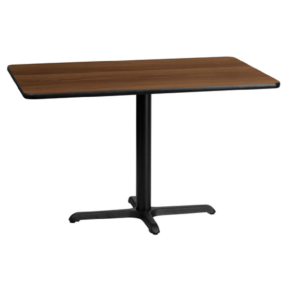 The Flash Furniture XU-WALTB-3048-T2230-GG Table 48"W X 30"D X 31-1/8"H Dining Height is a versatile piece of furniture designed for commercial use, ideal for different market segments within the hospitality and dining industries. This rectangular table measures 48 inches in width, 30 inches in depth, and 31-1/8 inches in height, offering ample space for dining purposes. The table features a 1-1/8 inch thick medium-density fiberboard (MDF) with a robust melamine core, ensuring durability and sturdiness. Its walnut laminate finish provides an elegant look, while the black PVC T-mold edge adds protection against wear and tear. The table is supported by a pre-welded top plate and a 22-inch by 30-inch x-base, complemented by a 3-inch diameter cast iron column with a sleek black powder-coated finish. This combination offers stability and a modern aesthetic. Shipped in three boxes, assembly is required upon delivery, and the table is typically in stock, allowing for quick shipment within 24 hours. The Flash Furniture XU-WALTB-3048-T2230-GG Table is a reliable and practical option for establishments looking to enhance their dining spaces with a functional and stylish piece of furniture.