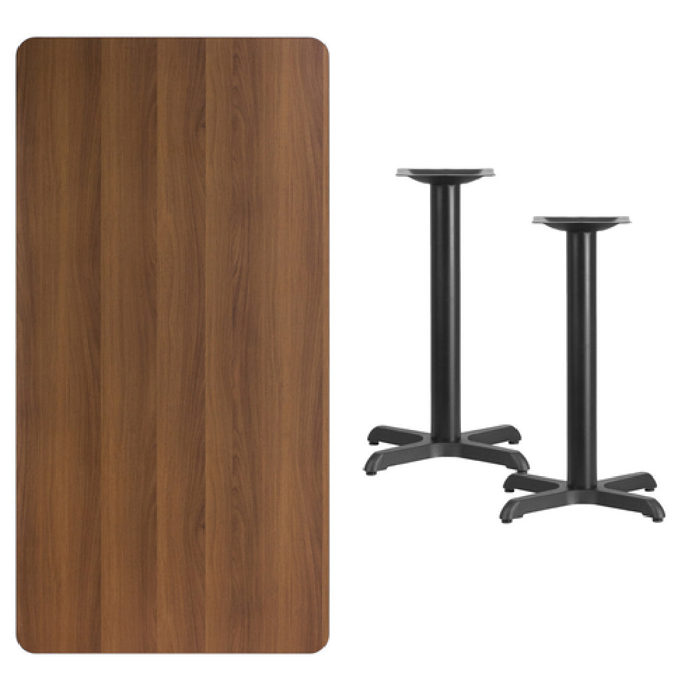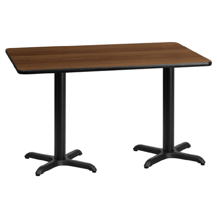 The Flash Furniture XU-WALTB-3060-T2222-GG Table is meticulously designed to cater to the diverse needs of commercial dining environments. Measuring 60 inches wide by 30 inches deep and standing at a dining height of 31-1/8 inches, this table offers generous surface space for patrons. It boasts a robust 1-1/8-inch thick MDF top with a melamine core, providing durability and a sophisticated walnut laminate finish that enhances its aesthetic appeal. The table's edges are protected by a black PVC T-mold, which adds to its longevity by preventing chipping and wear. Stability is ensured with its pre-welded top plate and two sturdy 22-inch by 22-inch x-bases, each supported by 3-inch diameter cast iron columns finished in a sleek black powder coating. This design not only assures robustness but also aligns with modern interiors. Delivered in three boxes, the table requires assembly, ensuring easy handling and setup in various commercial spaces. Available for prompt shipment within 24 hours for in-stock items, this table combines practicality with style, making it an ideal choice for restaurants, cafes, and dining facilities seeking reliable and visually appealing furniture solutions.