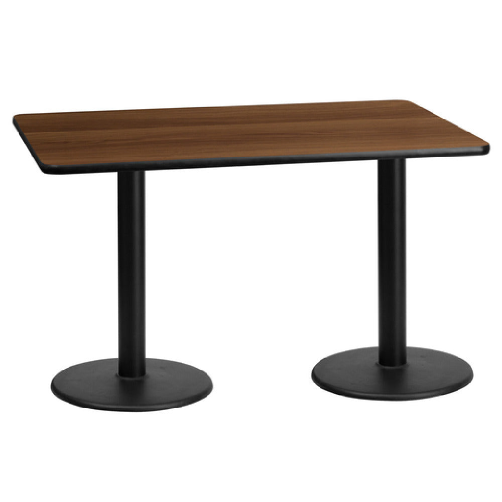 The Flash Furniture XU-WALTB-3060-TR18-GG Table is a versatile dining height table, meticulously designed for both commercial spaces and private settings. Measuring 60 inches wide, 30 inches deep, and standing at 31-1/8 inches tall, this rectangular table boasts a substantial 1-1/8 inch thick top crafted from MDF with a durable melamine core. Its sophisticated walnut laminate finish exudes a classic charm, while the black PVC T-mold edge offers enhanced protection and style. Structured for stability, the table features a pre-welded top plate supported by two robust 18 inch diameter bases and two 3 inch diameter cast iron columns, each adorned with a sleek black powder-coated finish. This table is shipped in three separate boxes for convenient transportation. Designed to meet the demands of commercial use, it requires assembly upon delivery. The Flash Furniture XU-WALTB-3060-TR18-GG Table is an excellent choice for establishments seeking a reliable and stylish dining solution, with in-stock items typically shipping within 24 hours. Its combination of functionality and aesthetic appeal makes it a valuable addition to restaurants, cafes, and other dining venues looking to enhance their dining environments with durable yet attractive furniture options.