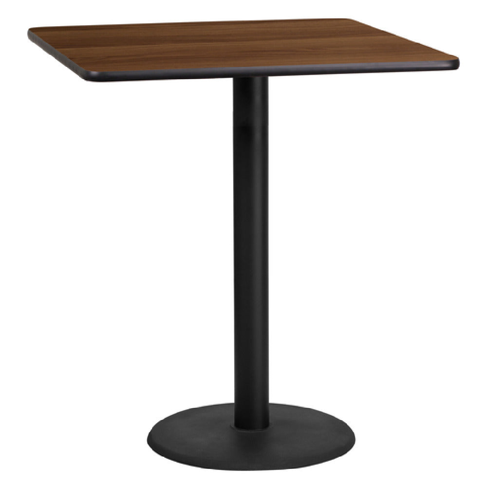 The Flash Furniture XU-WALTB-3636-TR24B-GG Table 36"W X 36"D X 43-1/8"H Bar Height is a versatile piece tailored for commercial environments that demand both functionality and aesthetics. At its core, the table features a substantial 1-1/8" thick MDF with a melamine core, providing a sturdy and reliable surface. The walnut laminate finish offers a sophisticated appearance, making it an attractive choice for various settings. Encased with a black PVC T-mold edge, the table's durability is enhanced, ensuring longevity even in high-traffic areas. Supporting the table is a 24" diameter base coupled with a 4" diameter cast iron column, finished with a black powder coating to resist wear and maintain its sleek look. Designed specifically for commercial use, this table requires assembly and is conveniently shipped in three boxes, with in-stock items typically dispatched within 24 hours. Its dimensions of 36"W x 36"D x 43-1/8"H make it an ideal bar height solution, perfect for restaurants, bars, and event spaces that seek a blend of practicality and elegance. The pre-welded top plate ensures easy assembly and stability, catering to the diverse requirements of the hospitality industry.