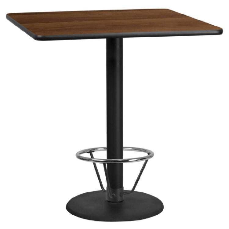 The Flash Furniture XU-WALTB-4242-TR24B-4CFR-GG Stiles Table 42"W X 42"D X 43-1/8"H is a meticulously crafted bar-height table designed for commercial use. With dimensions of 42 inches in width and depth, and a height of 43-1/8 inches, this square table provides ample space for various settings. Its top features a 1-1/8 inch thick MDF core with a walnut laminate finish, offering both durability and aesthetic appeal. The black PVC T-mold edge adds a layer of protection and style to the table's surface. The table's support structure includes a pre-welded top plate and a 24-inch diameter base, ensuring stability. A 4-inch diameter cast iron column with a black powder-coated finish further enhances its robustness. The 19-1/2 inch diameter chrome foot ring provides additional comfort and functionality. Shipped in three boxes, this table is ready for assembly and is typically available to ship within 24 hours. The Flash Furniture Stiles Table is ideal for diverse market segments within the hospitality and dining industries, combining practicality with a sleek design to meet the rigorous demands of commercial environments.