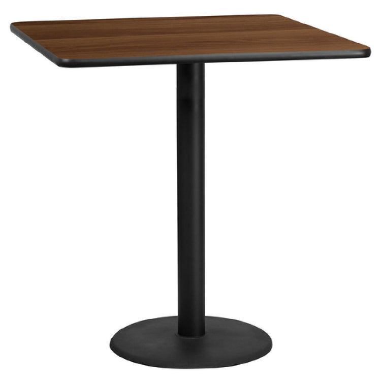 The Flash Furniture XU-WALTB-4242-TR24B-GG Table 42"W x 42"D x 43-1/8"H Bar Height is a versatile furniture piece designed to meet the diverse requirements of commercial settings. This square table features a sturdy 1-1/8" thick MDF construction with a melamine core, providing a durable and reliable surface for various applications. The walnut laminate finish gives it a sophisticated appearance, while the black PVC T-mold edge offers additional protection and a sleek look. A pre-welded top plate ensures stability, supported by a 24" diameter base and a robust 4" diameter cast iron column, both finished in a black powder coating. The table's bar height makes it ideal for use in bars, restaurants, or any setting requiring elevated seating, allowing for comfortable social interaction. Shipped in three boxes for secure delivery, this table requires assembly upon arrival. With the convenience of in-stock items usually shipping within 24 hours, the Flash Furniture XU-WALTB-4242-TR24B-GG is a practical and elegant choice for enhancing commercial interiors with a balance of style and functionality.