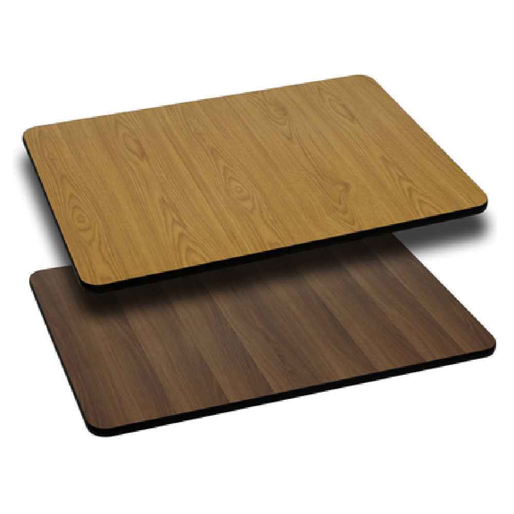 The Flash Furniture XU-WNT-2442-GG Table Top Rectangular 42"W X 24"D is a versatile piece designed for commercial use, making it suitable for diverse environments such as restaurants, cafes, and offices. With dimensions of 42 inches in width and 24 inches in depth, this table top provides ample space for various applications. Its 1-1/8 inch thickness ensures durability, supporting long-term usage in high-traffic areas. A unique feature of this table top is its reversible design, offering a natural laminate finish on one side and a walnut laminate on the other, allowing for flexible design choices to match different décors. The black T-mold edge adds a sleek finish while providing additional protection against impacts. Constructed with a high-impact melamine core, the table top delivers exceptional resistance to wear and tear, making it a reliable choice for commercial settings. Known for its practicality, this product boasts the convenience of quick shipment, as in-stock items are dispatched within 24 hours. The Flash Furniture XU-WNT-2442-GG Table Top combines functionality with aesthetic flexibility, making it a valuable addition across various market segments within the commercial furniture industry.