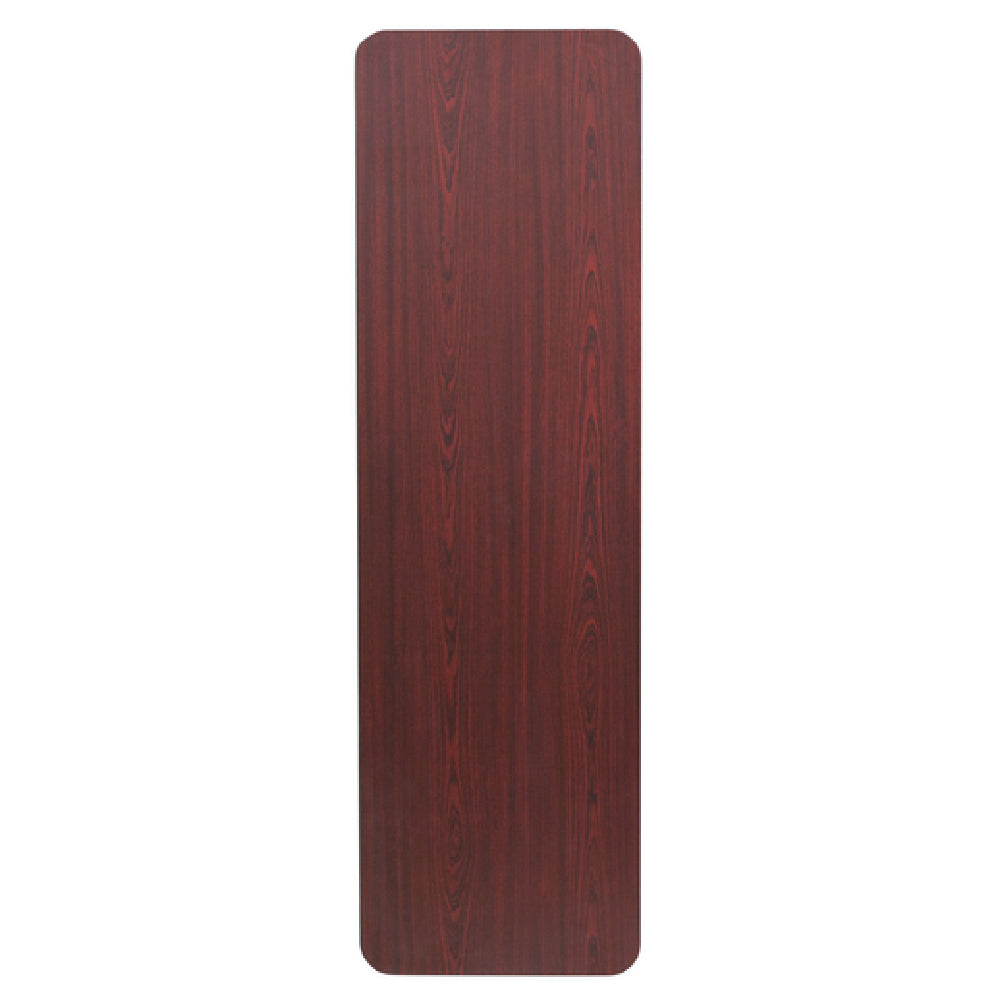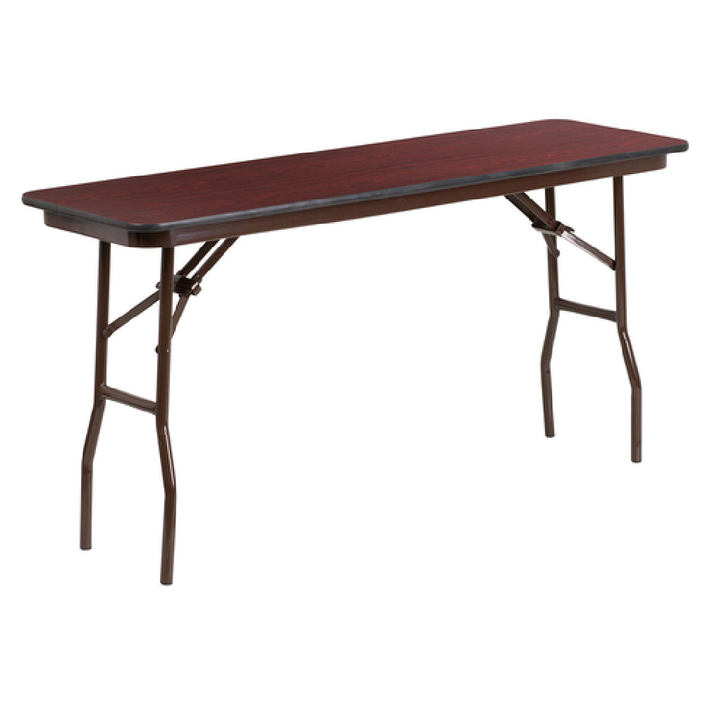 The Flash Furniture YT-1860-MEL-WAL-GG Folding Table 60"W x 18"D x 30"H is a versatile and practical choice for various commercial settings, offering a unique blend of durability and functionality. This rectangular table is designed with a 3/4" thick melamine laminate mahogany top, providing a sleek and professional appearance while ensuring resilience against daily wear and tear. The brown T-mold edge adds an extra layer of protection, preserving the table's integrity over time. Engineered with 18 gauge steel brown powder-coated pedestal legs, this table promises robust support and stability, capable of seating up to two adults comfortably. The inclusion of protective floor caps ensures that the table can be used on a variety of surfaces without causing damage, making it suitable for venues ranging from conference rooms to event halls. Specifically designed for commercial use, the table is readily available with in-stock items usually shipping within 24 hours, enabling quick and efficient service to meet urgent business needs. The Flash Furniture YT-1860-MEL-WAL-GG Folding Table offers distinct value for professionals seeking a reliable and space-efficient solution for their furniture requirements.