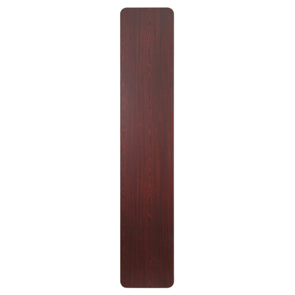 The Flash Furniture YT-1896-HIGH-WAL-GG Folding Table is a versatile piece designed for both commercial and personal use, featuring a rectangular shape with dimensions of 96"W x 18"D x 30"H. This folding table comfortably accommodates up to 4 adults, making it suitable for various settings, from conference rooms to family gatherings. The table's top is crafted from a 7/8" thick high-pressure laminate in an elegant mahogany finish, which provides both durability and a sophisticated appearance. The brown T-mold edge adds an extra layer of protection and style. Supporting the table are robust 18 gauge steel pedestal legs, which are brown powder coated for enhanced resistance to wear and tear, ensuring longevity even with regular use. Protective floor caps are included to prevent damage to floors, making this table ideal for venues where flooring preservation is a priority. Typically in stock items are shipped within 24 hours, ensuring prompt delivery for urgent needs. The Flash Furniture YT-1896-HIGH-WAL-GG Folding Table is engineered for commercial use, combining practical design with aesthetic appeal, and is an excellent choice for businesses and individuals seeking reliability and style in a folding table.