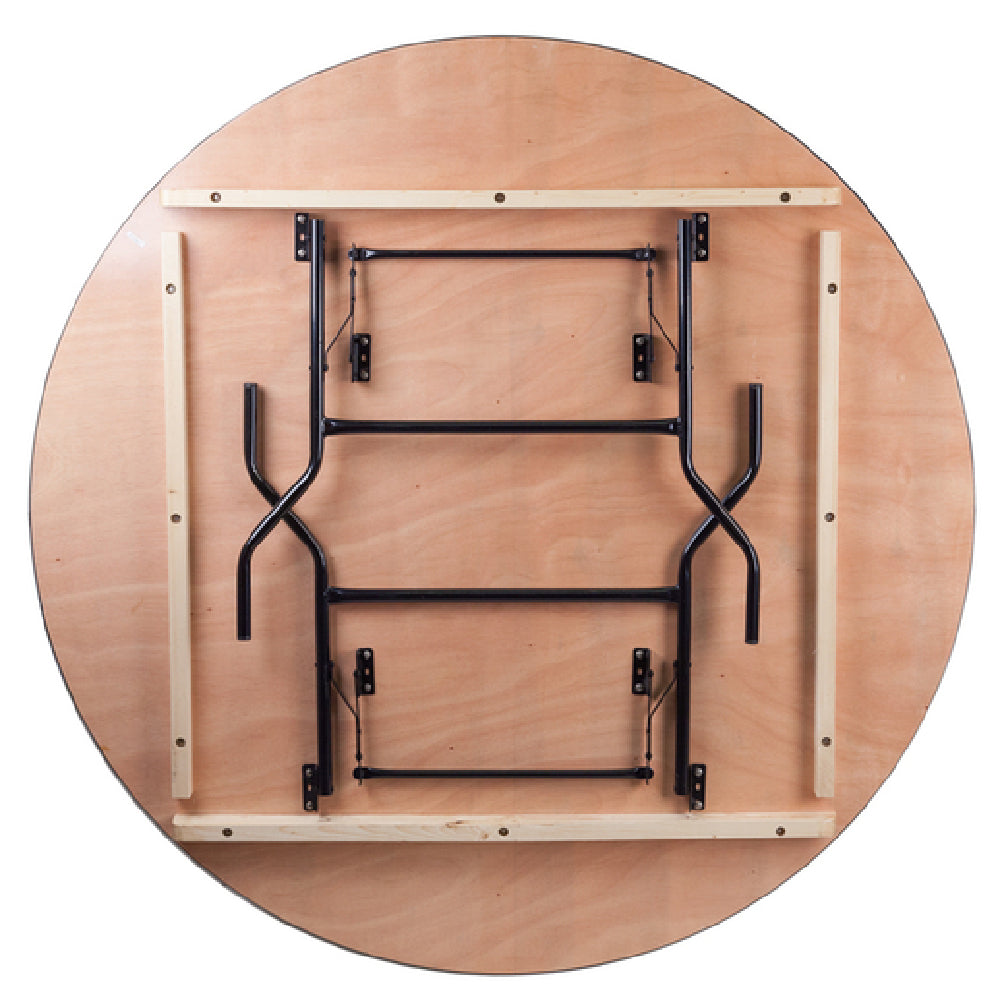 The Flash Furniture YT-WRFT66-TBL-GG Folding Banquet Table stands out with its versatile design and robust construction, making it an ideal choice for a variety of commercial environments. With a 66-inch diameter and a height of 30 inches, this round table comfortably seats up to 9 adults, catering to different group sizes and event settings. Its impressive 1000 lb. static load capacity ensures durability and reliability for various uses, from banquets to conferences. The table features a 3/4-inch thick plywood top, providing a sturdy surface, complemented by a clear-coated finish for enhanced longevity. The black PVC T-mold edge adds an extra layer of protection against wear and tear. Supported by 18 gauge steel wishbone legs with a black powder coating, it guarantees stability and resistance to corrosion. Additionally, protective floor caps prevent damage to flooring surfaces, ensuring the table's suitability for venues with high foot traffic. Designed specifically for commercial use, this folding table is also highly practical, with the ability to ship within 24 hours when in stock, meeting the fast-paced demands of business operations. The Flash Furniture YT-WRFT66-TBL-GG Folding Banquet Table is a reliable, space-saving solution for professional settings that demand both functionality and durability.